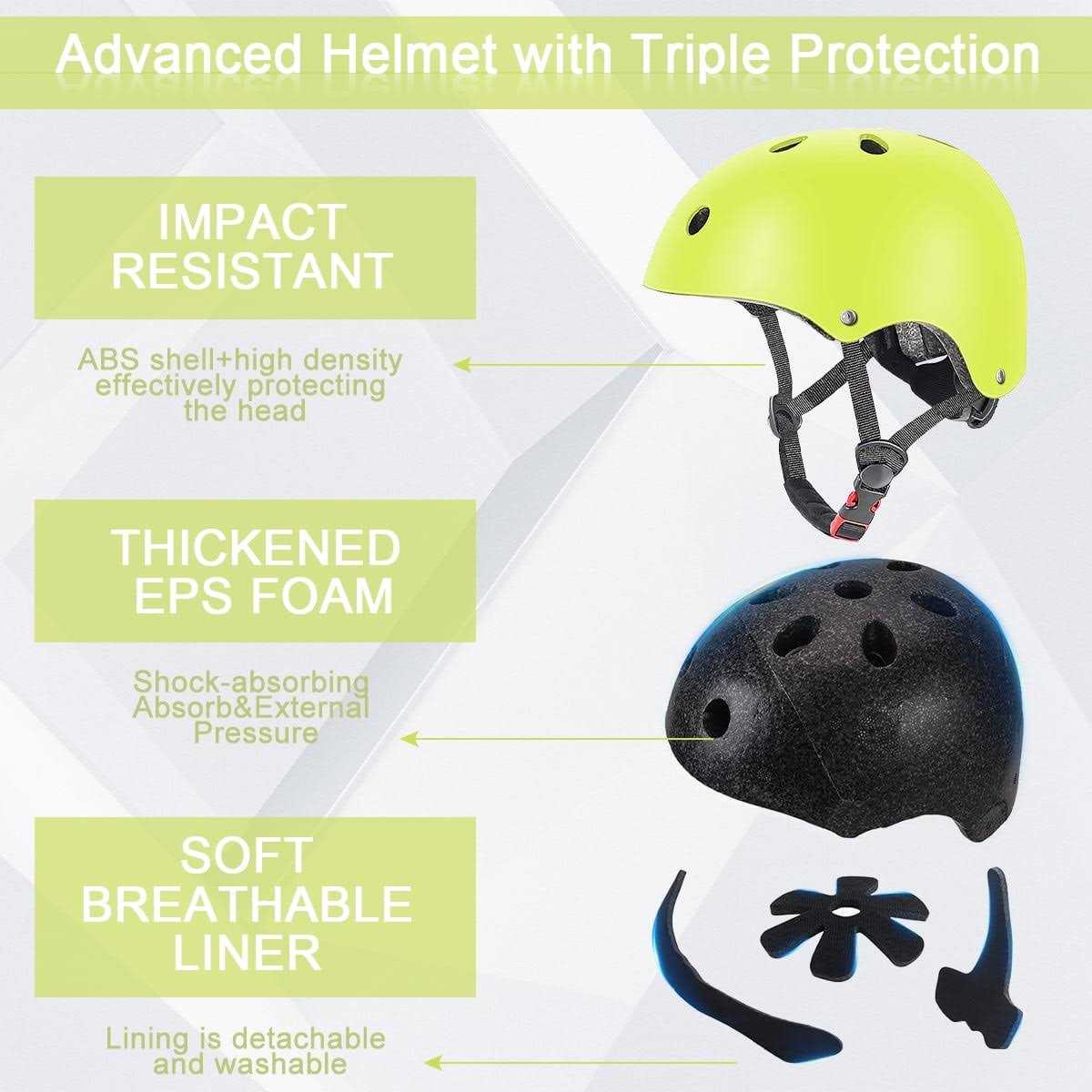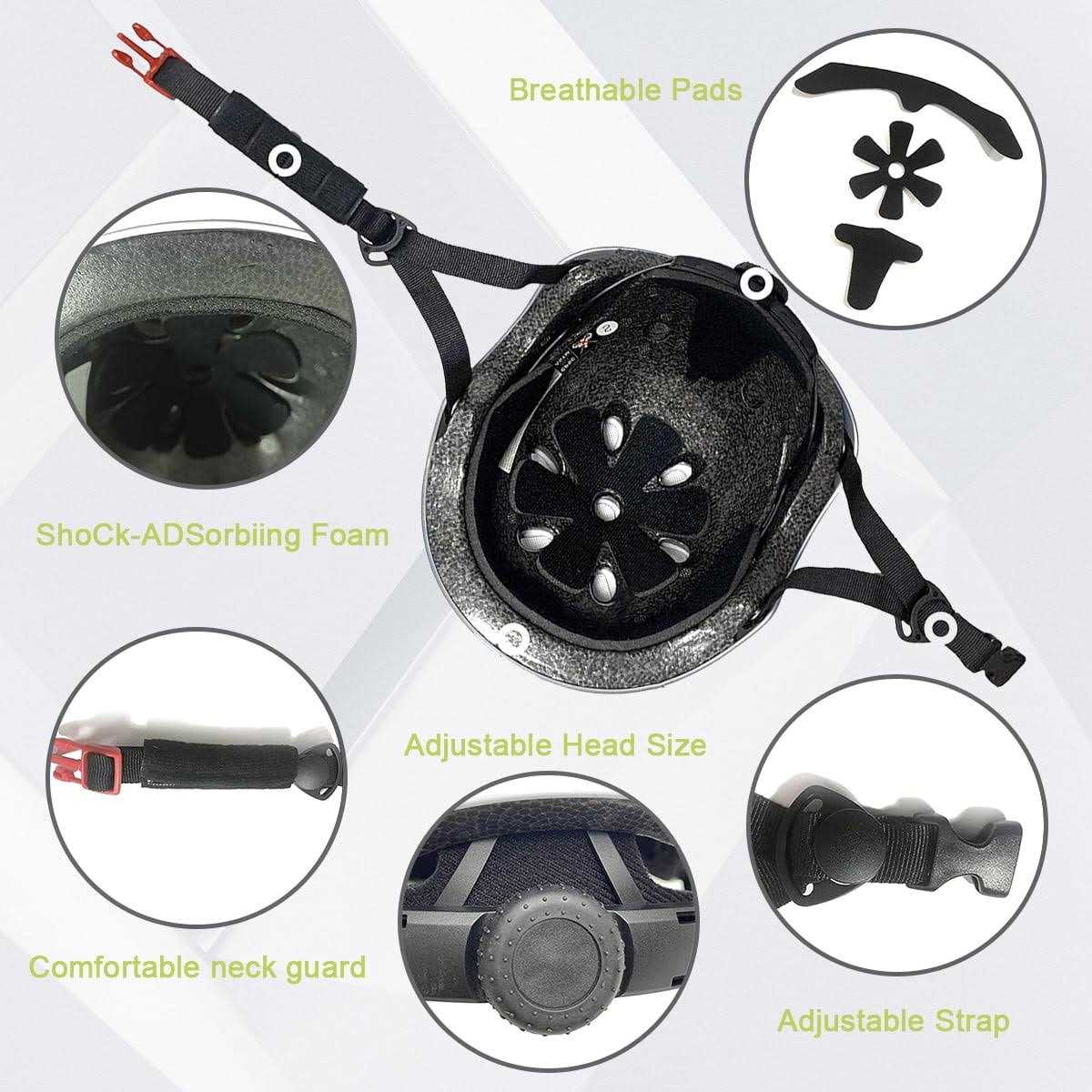 The helmet is ideal helmet for biking, skateboarding, long boarding, inline skating (roller blading) and roller skating. Lightweight and superbly well ventilated these skate helmets will ensure that you are protected from serious head injuries. The helmets are designed for maximum comfort to allow you to concentrate on your riding with the confidence that you have full head protection. And the protective gear set is specially designed to offer you perfect protection for skateboard, roller blading, bicycle and many other outdoor sports.