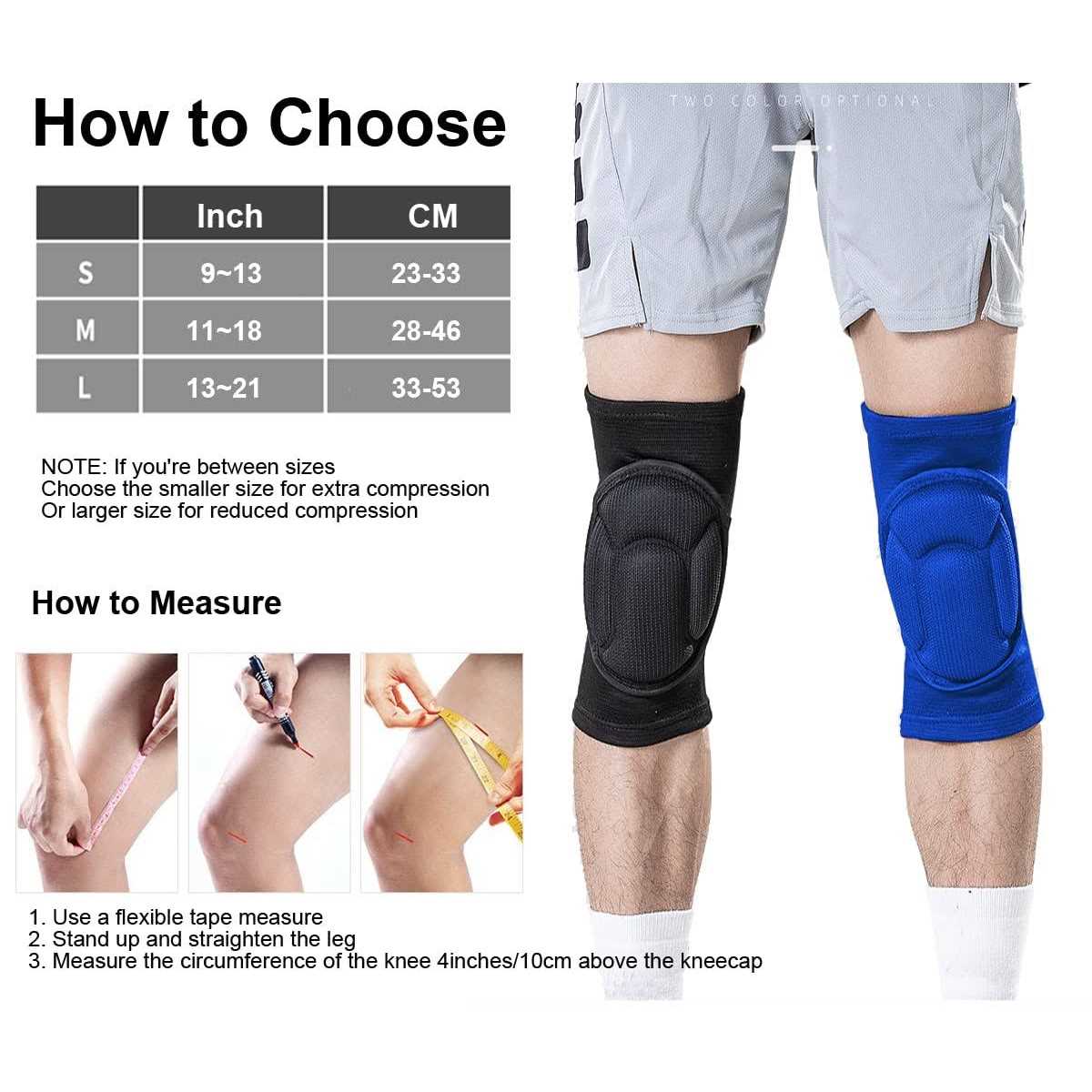 Knee Pads of Comfortable, Soft, Breathable and Flexible 1. Made of soft and breathable fabric, durable and skin-friendly, comfortable to wear and easy to carry. 2. Absorbent fiber wicks away moisture quickly. 3. Anti-collision pad can disperse the pressure of the joints. 4. Good elasticity prevents the knee compression sleeve from rolling, sliding or slipping down. 5. Suitable for multiple sports, can be used for dance, training, fitness, ball sports, etc. 6.hand wash with water temperature under 40°C, or soft machine wash, natural dry, not ironing, do not use detergent and bleach. Product Details Material: Polyester, EVA pad inside. Weight: X-Small 0.16lbs, Small 0.18 lbs, Medium 0.2 lbs, Large 0.23 lbs. Size X-Small-length: 7-9 inches; knee pads for kids (4~7 years old) Small-length: 9-13 inches; knee pads for kids (7~12 years old) Medium-length: 11-18 inches; knee pads for adult (88~143 lbs) Large-length: 13-21 inches; knee pads for adult (144~198 lbs) Tips for Measuring 1. Use a flexible tape measure. 2. Stand up and straighten the leg. 3. Measure 4inches/10cm above the kneecap.
