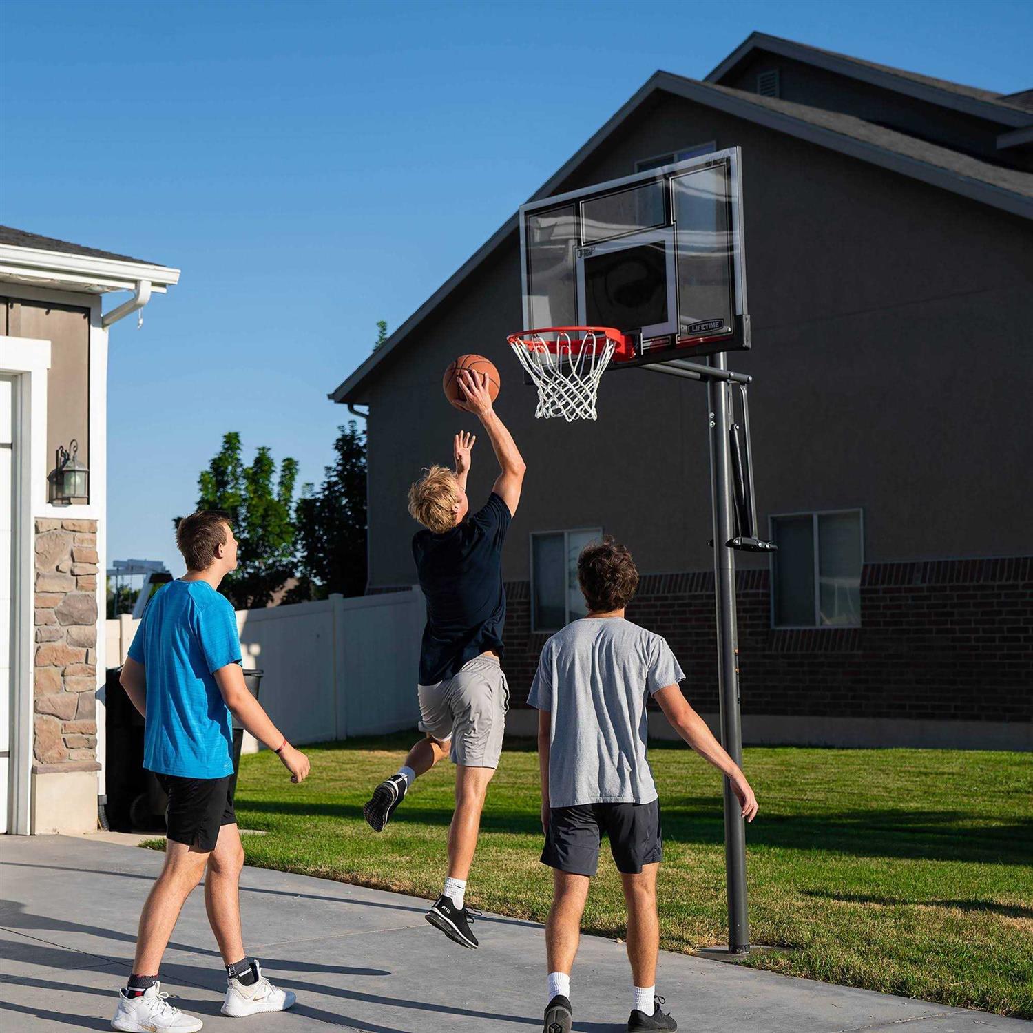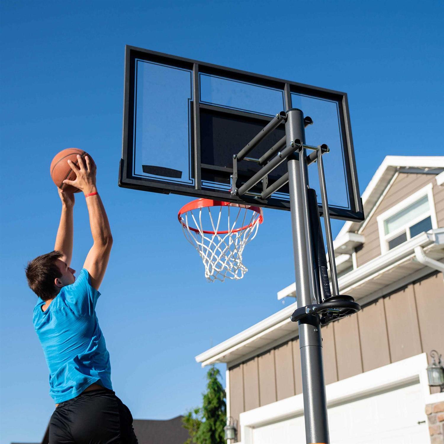 Lifetime In-Ground Basketball System with 54″ Shatterproof Backboard – 71525-LIFETIME The Lifetime 54 Inch In-Ground Basketball System is a great solution for people who love playing basketball and want a permanent hoop that’s sturdier than a portable system. The pole is made of rust-resistant steel and the polycarbonate backboard is practically indestructible. There’s also an easy-to-use pneumatic Power Lift height adjustment system that allows anyone to easily adjust the height of the backboard from 7½ to 10 feet. This is a basketball hoop that will be around for years. Rugged All-Weather Construction This 54” in-ground basketball system is designed to go in the ground and never come out unless you want it to. The pole comes in 3 sections and is made of steel that’s been treated with a weather-resistant powder coating to protect against rust and corrosion. The steel-framed backboard is made of Makrolon which is a shatterproof polycarbonate material. The backboard is also treated with a UV-protected ink that prevents fading and cracking due to exposure to the elements. The pole can be permanently mounted directly in the ground or in a Lifetime ground sleeve that allows it to be relocated if necessary. Power Lift Height Adjustment System Adjusting the height of a backboard can be a hassle, but, thanks to Lifetime’s pneumatic Power Lift height adjustment system, it’s a breeze for anyone to make height adjustments safely and easily. All you have to do is squeeze the handle and you can raise or lower the height of the backboard in 6-inch increments between 8 and 10 feet.