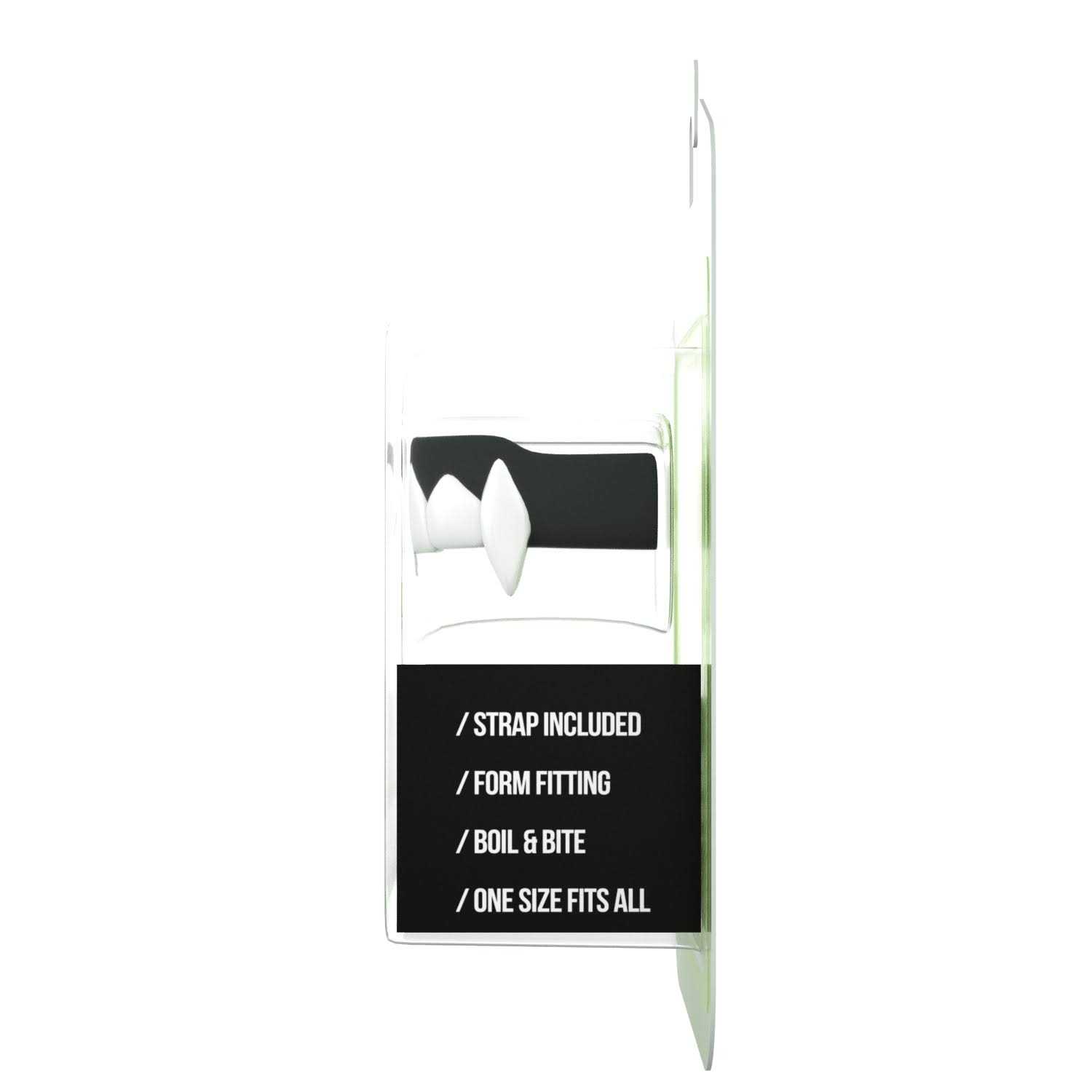 BOIL & BITE FANGS MOUTHGUARD FEATURES – Boiling Required – Fang Teeth Design – Not Braces Friendly – Removable Strap – Attach To Your Helmet + Play! – Unisex – One Size Fits All – Braces Friendly MATERIAL – 100% Medical Grade Silicone – Durable + Comfortable – Dishwasher Safe – Odor + Stain Resistant – Hygienic + Hypoallergenic – Colors Will NOT Fade SAFETY TESTED LOUDMOUTHGUARDS Have Been Awarded A Children’s Product Certificate Phthalate Free – Lead Free – Use + Abuse Tested By A Consumer Product Safety Commission (CPSC) Accepted Third Party Laboratory ONE-OF-A-KIND DESIGN: Stand out with our 3D Vampire Fangs Boil & Bite mouthguards for sports. This one of a kind design is built for any contact sport and will make you stand out from the competition. It’s ultra high quality construction provides maximum protection and has been tested and approved by athletes. THE PERFECT CUSTOM FIT: Get a custom form fitting mold for maximum comfort with our new boil & bite design. Don’t worry if you don’t get it right the first time you can re-boil and re-mold as many times as you need to meet your desired fit. For youth sizing simply cut the mouthguard at the dotted lines marked “youth”. INCREASE PERFORMANCE: The efficient form fitting design promotes easy breathing for increased oxygen intake to improve performance and recovery. You don’t have to sacrifice style for comfort, the Loudmouth 3D Vampire Boil & Bite mouthguard has both. EASY TO USE: Simply unpackaged the mouthguard and follow the provided molding instructions and be ready for action in just a few minutes.