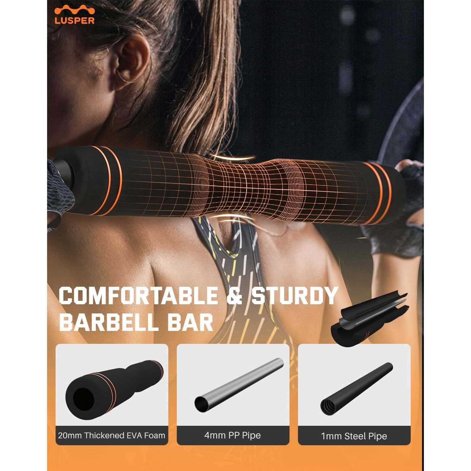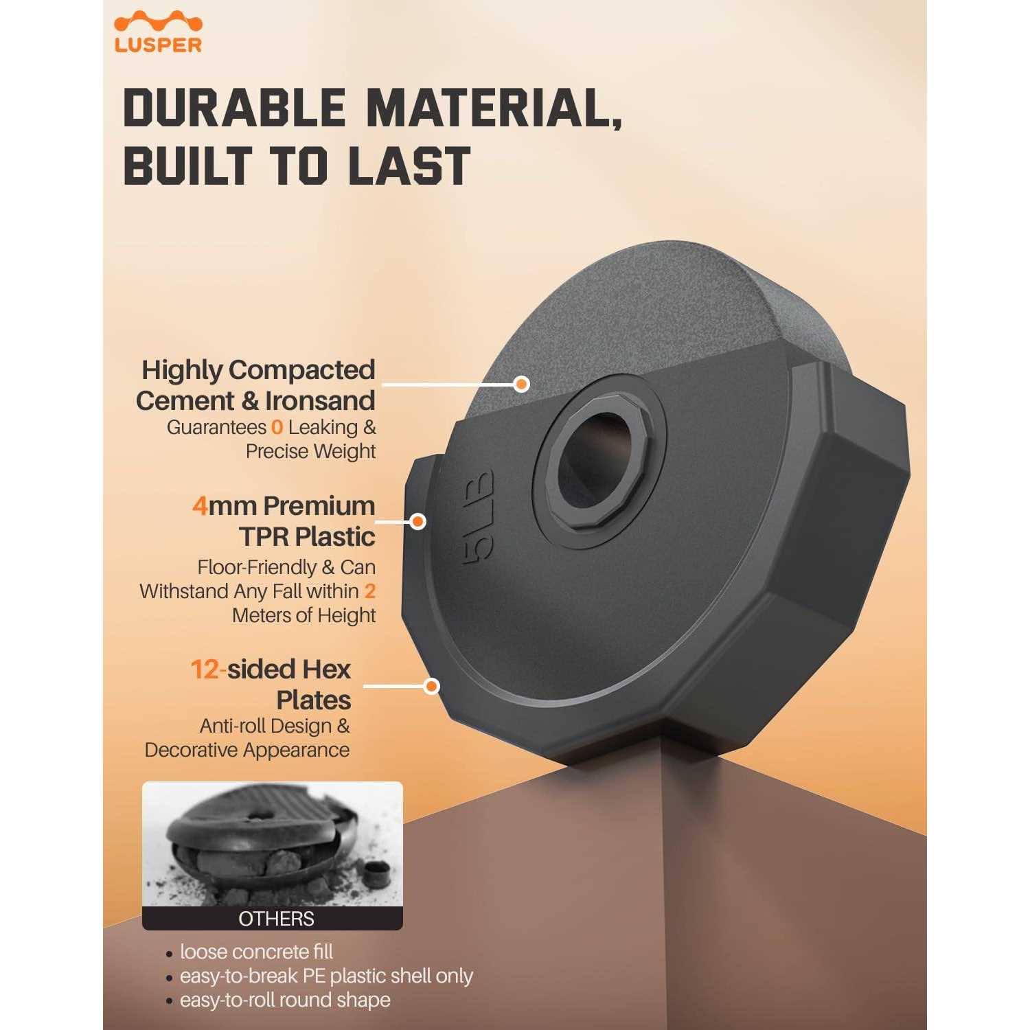 【3 Modes in 1 Set】Lusper Adjustable Weight Set allows you to switch the weights into 3 modes according to your needs: 1) Dumbbells are great for targeted muscle training and improving coordination and balance. 2) Barbell provides higher load and stability for overall strength training and posture control. 3) Kettlebell combines strength, endurance, and explosiveness for cardio and flexibility training. [WEIGHT RANGE]: Dumbbell 6.5lbs-32lbs, Barbell 8lbs-44lbs, Kettlebell 3.5lbs-16lbs. 【Upgraded Spinlock Collars, Safety Guaranteed】The anti-slip tightening collar ensures a safe and secure fit to the dumbbell or barbell bar. No worries with it loosening or plates sliding/falling. Smooth contoured finger tip grips ensure quick and easy mode switching. 【Highly Compacted & Built to Last】The core of the weight plate is concrete mixed with cement and ironsand, which guarantees zero leaking and true weight. Coated with premium quality plastic, the plate does not break with any fall within 2 meters of height. Safe and secure; sound proof & flooring protective. 【12-Sided Hex Plates, Secure & Sleek Design】The anti-roll hex plates in the Adjustable Dumbbell Set are specially designed to keep your workouts safe and efficient. The Adjustable Weights boasts its nice-feel texture and a sleek black & gray design that naturally blends into any home gym style. 【Ergonomically Designed for Optimal Comfort】The PP material coasted steel dumbbell handle designed with anti-slip texture to provides you a comfortable & secure grip. The 20 mm thickened barbell connector is ergonomically designed to have a curvy shape that fits your neck perfectly for increased comfort. Rubber kettlebell handle delivers exceptional control and is slip resistant even with sweaty hands. 【Suitable for Home Gym & More Weight Options】The space-saving and easy-to-assemble features make Lusper versatile weight set a perfect match for your home gym. What you can get from the Set: Weight Plates 2.75 lbs *8, Weight Plates 5 lbs *4, Dumbbell Handles *2, Barbell Conncector *1, Kettlebell Handle *1, Kettlebell Base Rod *1,Spinlock Collars *6, Workout Guide *1.