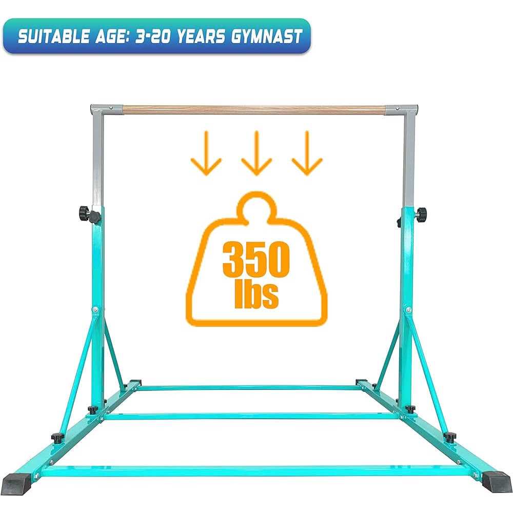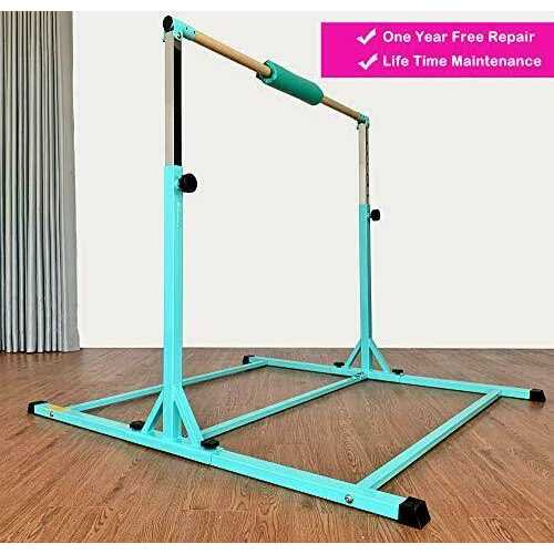 【IT IS ONE PROFESSIONAL GRADE GYMNASTICS BAR】 This gymnastic bar is one professional grade kip bar for kids and teenage between 3 – 20 years old, weight capacity is up to 350 lbs. Big triangle structure improve overall stability. And handle design on base makes bar easy to assemble and disassemble. When you do not use it, you can disassemble it and put them against wall or under the bed, and when you are on holiday, you can carry it with you. 【IT IS ONE SAFE GYMNASTICS BAR – PERFECT MATERIAL】 ※Crossbar is made of fiberglass with wood cover, compared with other material, it is more Strong and Durable and Flexible, and give kids professional feeling as competition. ※Adjustable Pole and frame are made of Strong Heavy Duty Steel, this material make the gymnastic bar more heavier and improve overall stability and safety. ※All round Welded, more safe. 【IT IS ONE IDEAL SIZE Gymnastics Horizontal Bar For Kids Home and Gymnastic Center】This type of gymnastic training bar set is designed for kids and teenage who hope to improve their gymnastics levels. Length is 5 Ft, width is 4ft, height is adjustable, 13 levels, from 36inch to 60inch, compared with 10 height levels bar, 13 height levels give kids more choices. The size is neither large nor small, ideal for home and gymnastic centre use.
