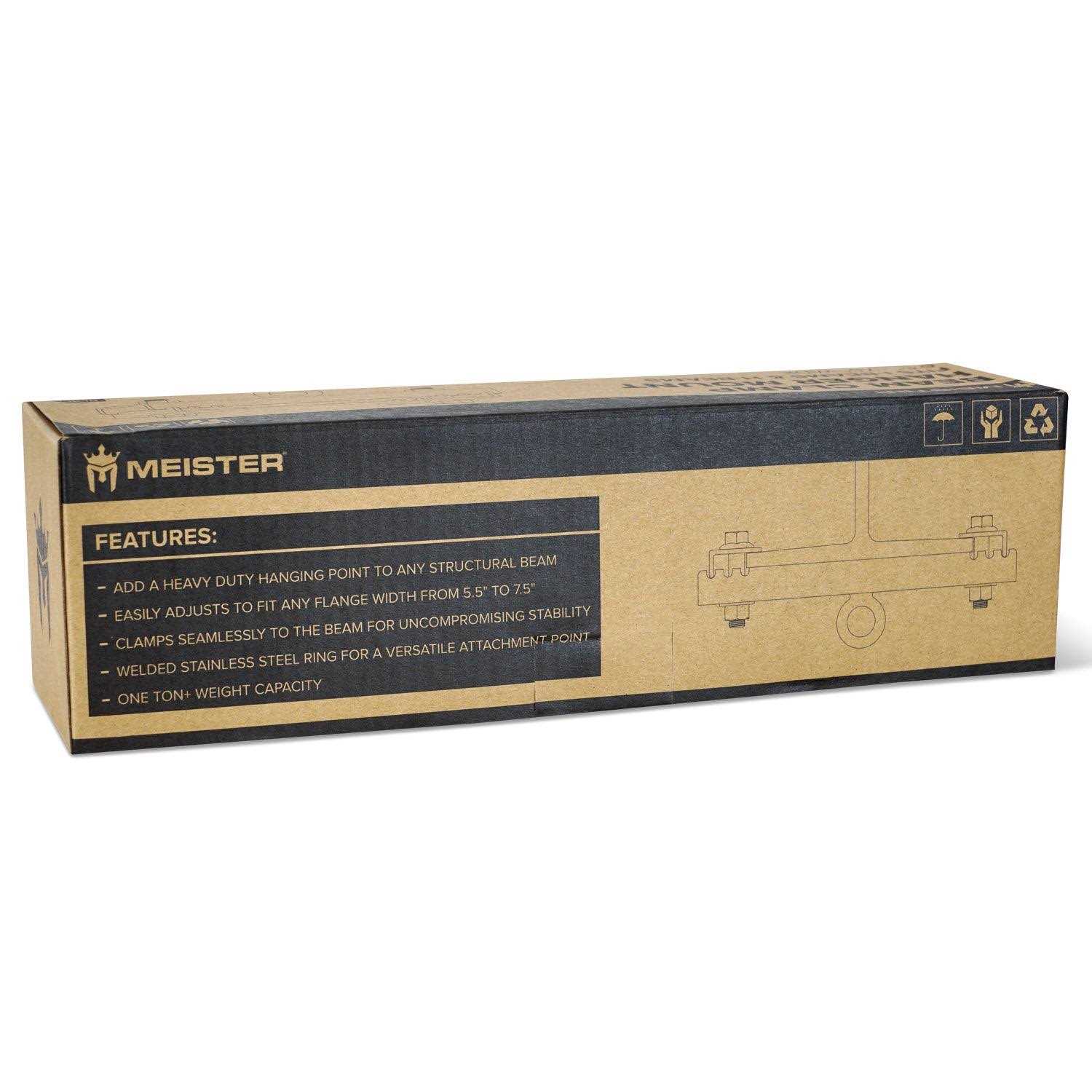 The Meister Beam Clamp Hanger Mount allows you to create a secure mounting point on any structural H or I style metal beam in just seconds. Whether you’re hanging a boxing heavy bag, suspension training straps, AV rigging equipment or almost anything else, you can count on this versatile mount to support it. Constructed from thick, construction-grade steel with a durable textured powder coated finish, this high-capacity mount can handle loads in excess of one ton. Adjustable steel jaws on each side of the base allow you to fit the mount seamlessly to your specific beam for a secure and stable mount that can be removed without permanent damage to the mounting beam. The 28mm diameter, stainless steel M12 mounting ring can accommodate carabiners, chains, ropes and other attachments. The Meister Beam Clamp Hanger Mount is an ideal mounting solution for high-use applications such as commercial gyms that need the flexibility to move and rearrange mounting points over time. Choose the size you need based on the flange width of your beam: [3.5 inch – 5.5 inch] or [5.5 inch – 7.5 inch]. Dont stress or guess if drilling through a beam will compromise the integrity and strength of a major building component. No matter what you are hanging, count on the Meister Beam Clamp Hanger Mount to create a secure and easy-to-install mounting point in seconds.