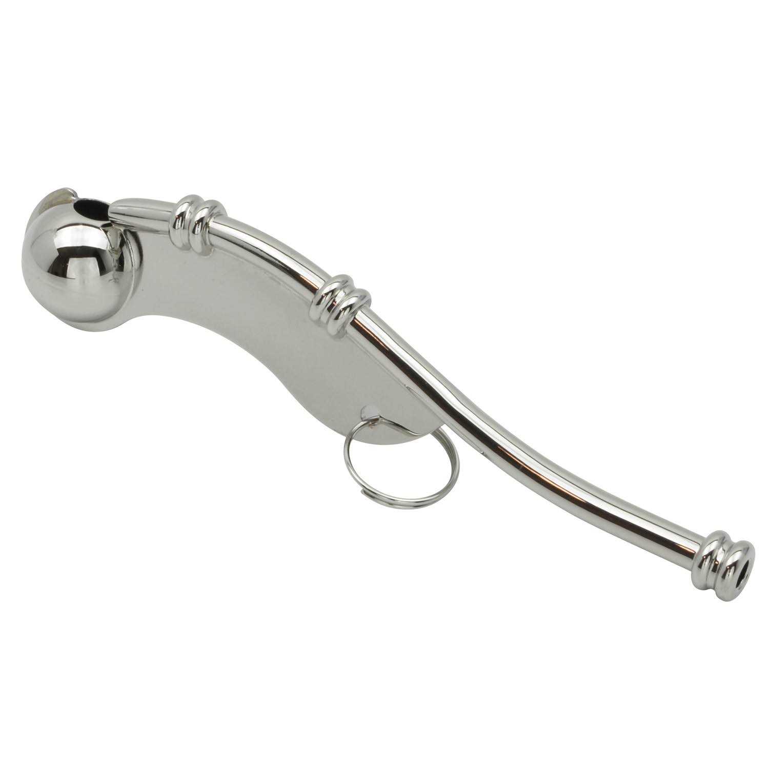Bosnian whistle made of nickel-plated copper with anti-corrosion properties For easy carrying and storage, the whistle uses an O-Ring that allows the whistle to be hooked up. It is pronounced, and sometimes spelled, “bosun’s call”. The pipe consists of a narrow tube (the gun) which directs air over a metal sphere (the buoy) with a hole in the top. The player opens and closes the hand over the hole to change the pitch. The rest of the pipe consists of a “keel”, a flat piece of metal beneath the gun that holds the call together, and the “shackle”, a keyring that connects a long silver or brass chain that sits around the collar, when in ceremonial uniform. Historically the boatswain’s call was used to pass commands to the crew when the voice could not be heard over the sounds of the sea. Because of its high pitch, it could be heard over the activities of the crew and bad weather. It is now used in traditional bugle calls such as Evening Colors/Sunset, and in other ceremonies in most modern navies. It is sometimes accompanied by other auditive features such as ruffles and flourishes, voice commands and announcements, or even a gun salute.