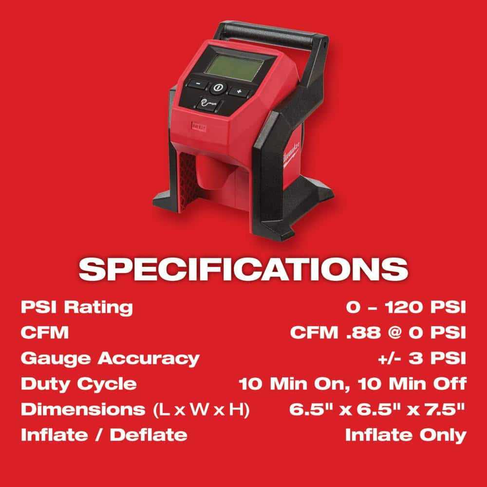 Fastest Cordless Tire Inflator. The Milwaukee M12 Compact Inflator delivers fast, accurate, easy inflation with the portability to take anywhere. The inflator has the capability to complete demanding applications like car, LT truck, and compact equipment tires, the M12 Compact Inflator gives users ultimate power and efficiency. Rated to deliver over 120 PSI, The high efficiency motor and pump top-off car tires in under 1 minute. The True Fill Auto shut-off technology delivers highly accurate pressure, protects from overfill, and automatically senses speed of fill to deliver precise shut-off at the desired PSI. Additionally, the unit includes a large easy to read back-lit LCD, anti-vibration feet, and 26 -Inch hose with an all brass Schrader chuck.