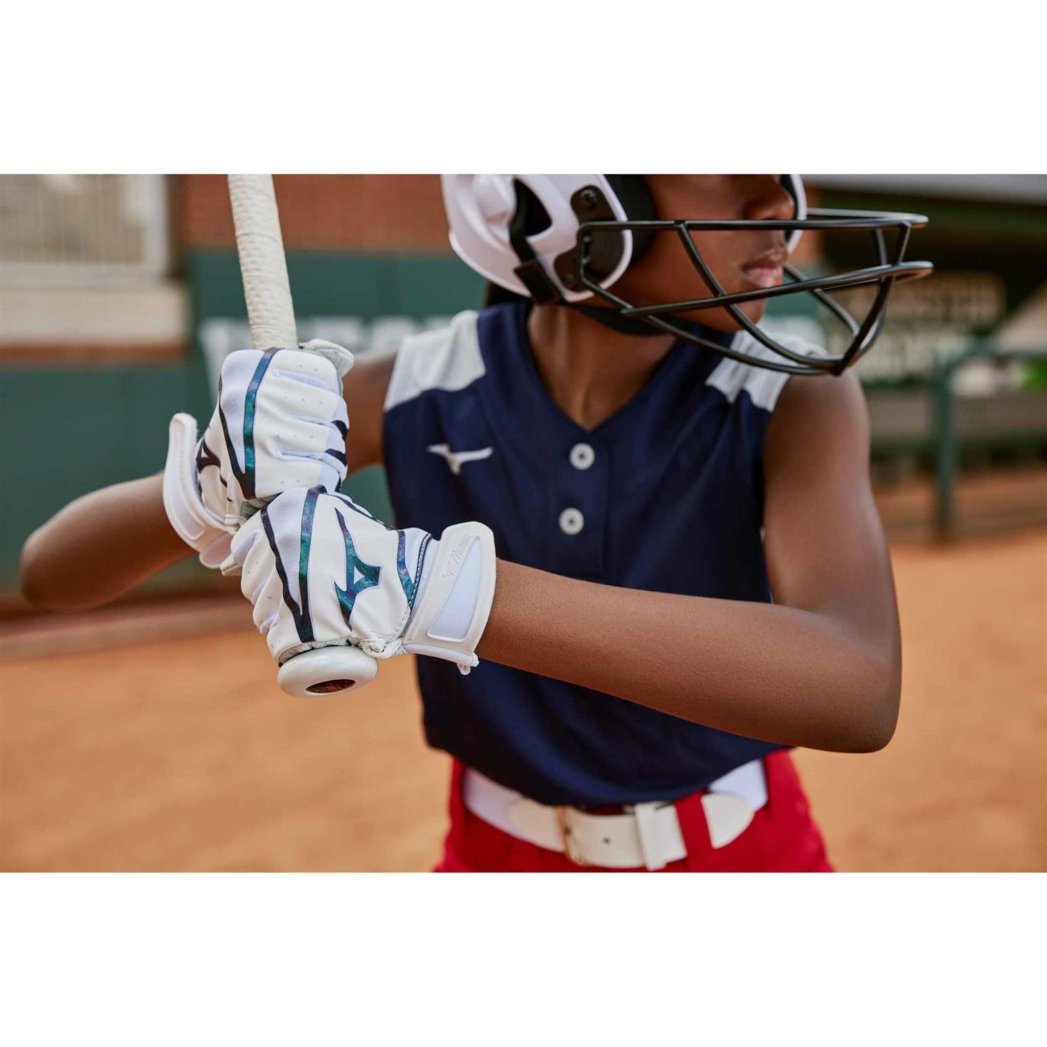 Batting Gloves by Mizuno. Details:Gender-engineered specifically for softball players, the new F-257 batting glove is power-packed with premium features. Made with embossed full grain leather palm to give players a combination of a great feel with increased durability. Designed with Mizuno AirMesh for maximum flex and breathability. Our quick adjust wrist tab combined with a neoprene wristband for a secure fit and great feel.