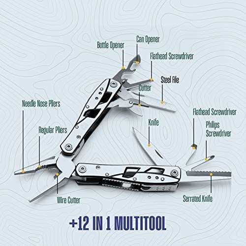 Multitool Plier – 12 in 1 Stainless Steel Pocket Multi Tool with Durable Sheath for Camping, Survival Gear – Safety Locking Camping Accessories with