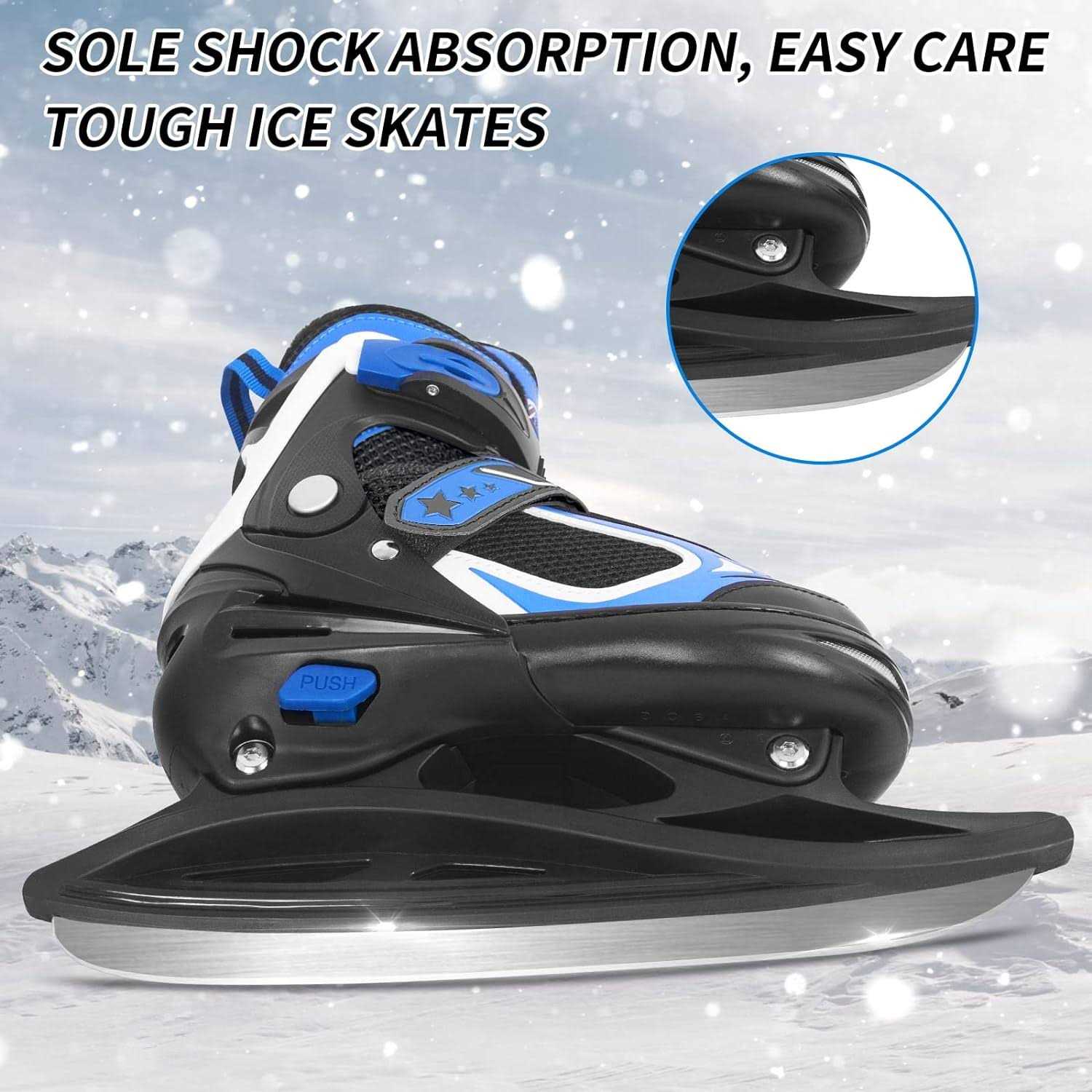 Nattork blue large ice skate! This pair of skates has a warm velvet lining and reinforced ankle support design to give you the warmest and most comfortable experience! You can not only choose the right size among the four sizes, but also adjust each size arbitrarily. Adjustable safety lock bucklesPower Strap, and laces for a secure fit. The stainless steel blade is easy to sharpen, allowing you to slide smoothly on the ice. Whether it’s leisure skating or ice hockey, this skate shoe is your best choice!