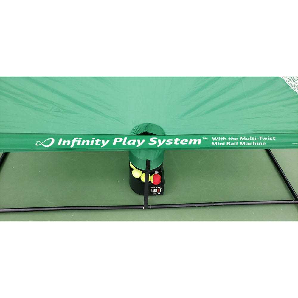 Ball return net designed for pickleball practice. Available with or without the MultiTwist Mini Ball machine that throws pickleballs up to 20ft. Steel frame, nylon net, easy setup. OnCourt OffCourt Infinity Play Pickleball System Skip breaking your back picking up balls when practicing on a pickleball court, instead rely on the OnCourt OffCourt Infinity Play System. Available with or without the integrated MultiTwist Mini Ball Machine, this lightweight and easy-to-setup net catches balls that you hit before feeding them into the ball machine so that you can continue to work on any and all of your shots. Once you return the ball with a simulated third shot drop or precise pass, The MultiTwist Mini Ball Machine is poised to return it to you. This portable machine runs on 6 “D” batteries, holds up to 13 pickleballs (plus the balls in the net), and is able to shoot the balls back to you every 3.5 seconds. Multiple settings throw the ball between 10 and 20 feet so that you can work on whatever aspect of your game has been letting you down.
