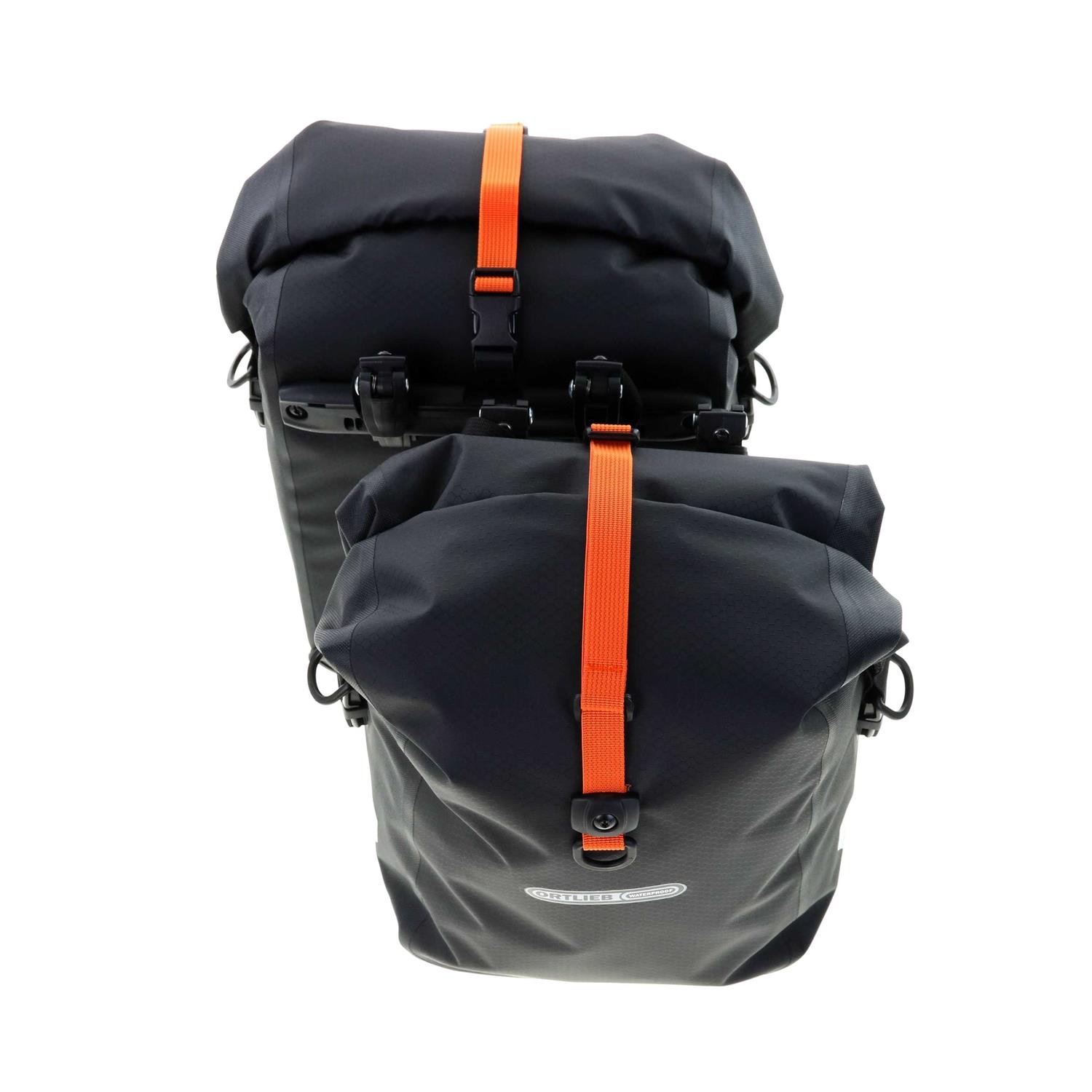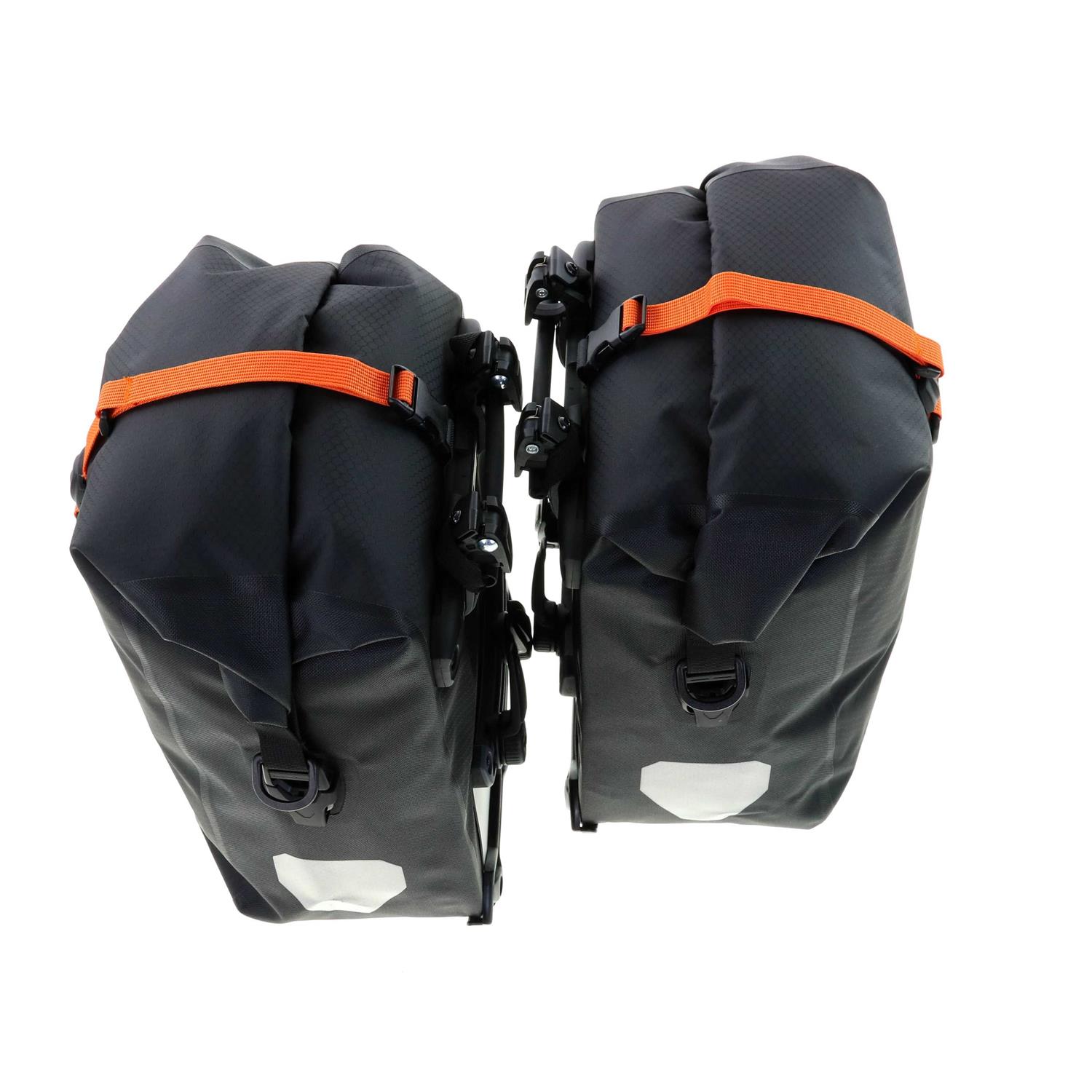 Ideal Low Rider Front Panniers The Ortlieb QL2.1 Gravel Pack pair of panniers are ideal for use on your front low rider racks for multiday tours and self-supported races. The Ortlieb Gravel-Pack duo offers you a combined payload of 25 litres for additional gear such as mess kits, food and other 嚙踝蕭luxury嚙踝蕭 items. Mounting the Pack to your lowrider bike rack allows you to maintain a low centre of gravity and undiminished off-road agility, despite your extra gear. Lightweight and Waterproof The Pack嚙踝蕭s streamlined minimal design, without inside pockets and a shoulder-strap pad, helps to keep it in the featherweight class. The lightweight, wear-resistant material withstands even the harshest of rock and gravel conditions you encounter on your way. And no matter how wet the weather, your things will stay dry thanks to the proven Ortlieb waterproof quality and roll closure. Lightweight and Waterproof With the QL2.1 system and two mounting hooks, the Gravel-Pack panniers remain securely attached to your bike rack as you adventure through the landscape on your gravel, mountain, or fat bike.