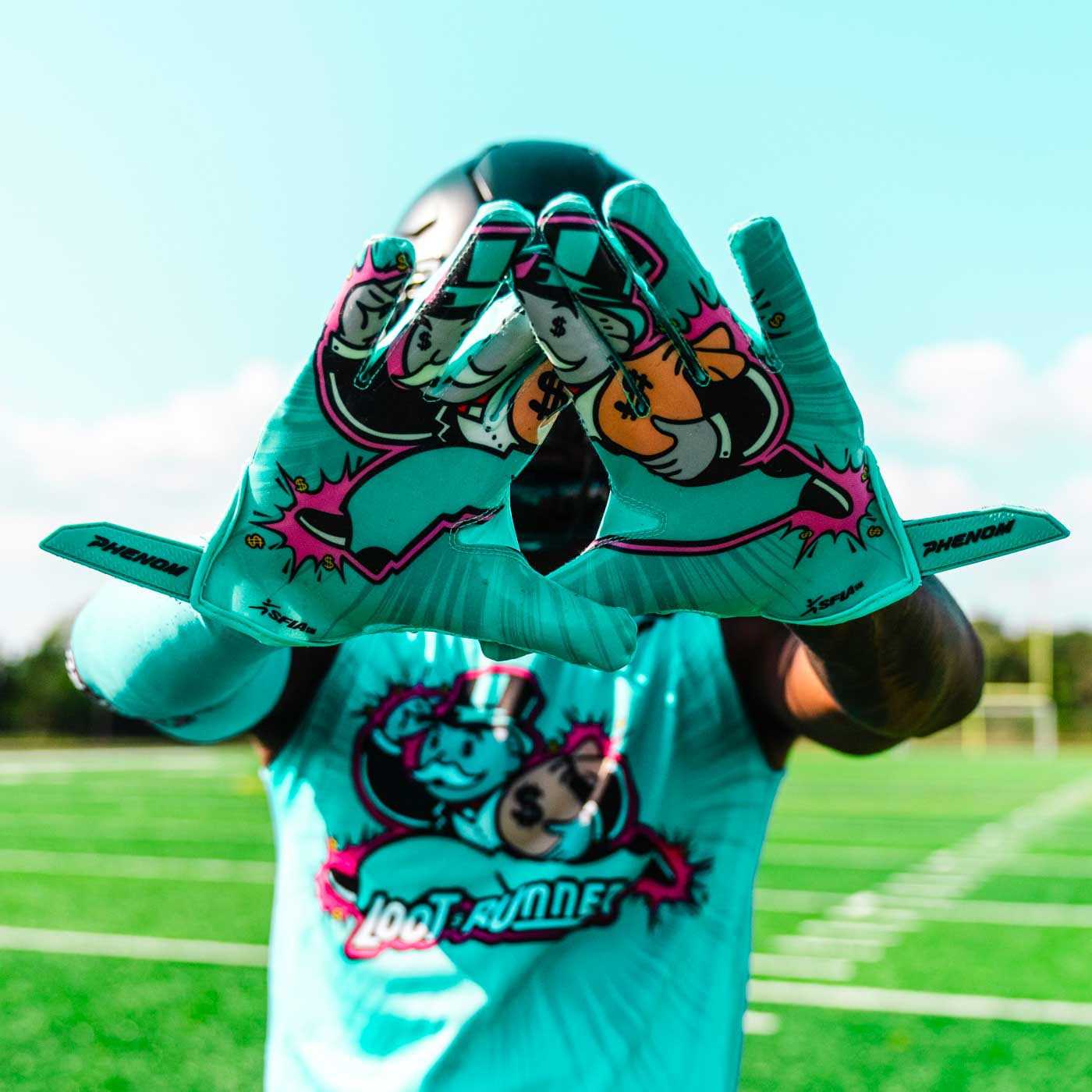 The “Loot Runner” Edition gloves are a symbol of the unyielding pursuit of success, both on and off the field. Enveloped in the vibrant energy of Miami Vice colors, each pair tells a story of relentless ambition, embodying the spirit of athletes grinding to secure their bag. Every catch is money and every move is a step closer to a way out. Run up that check! Product Specs VPS5 Model by Phenom Elite Vapor-Stick grip technology pushes the grip to its legal stick limit. Extended grip surface on the palm and the pinky finger. Vapor-Dri material is the top of the line in fit, breathability, performance, and strength. Lightweight yet durable. Reinforced stitching at weak points with added durability. Exclusive Color Way – Teal base, enhanced by the iconic black and pink accents.