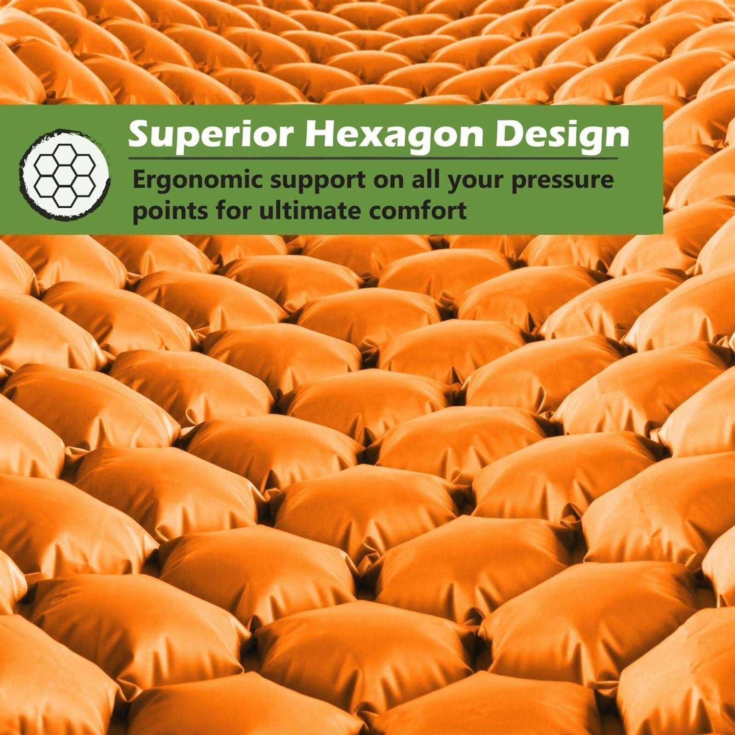 Our revolutionary hexagon design is made special with body mapping technology. The hexagon air cells ergonomically support all of your pressure points, giving you superior support and comfort all night long, no matter how you sleep! The mat is also a camping gear must-have luxury, being comfortable yet lightweight. It rolls up small, making it effortless to carry around. Comes in a variety of color choices, sure to match anyone’s personality.