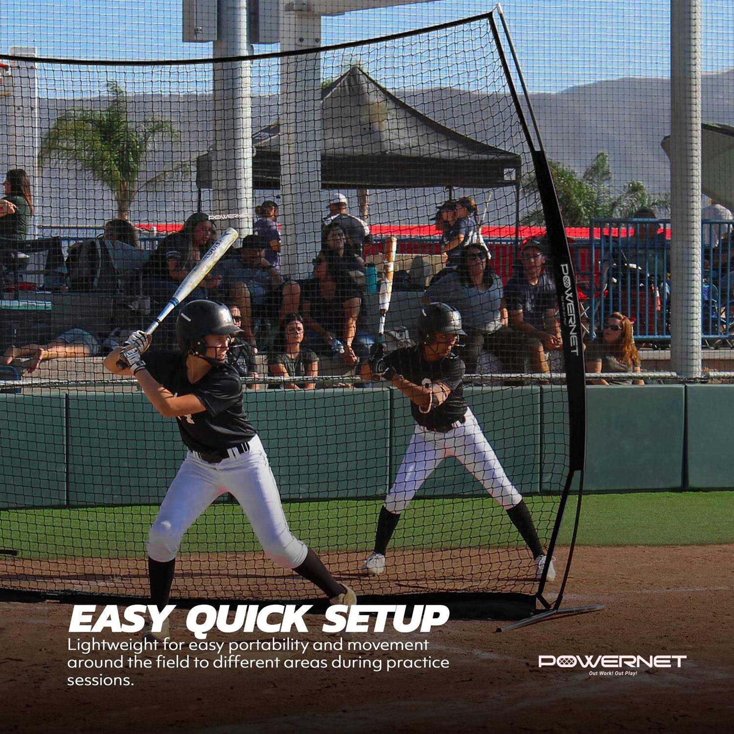 12’x9′ BARRIER NET; This instant portable protection screen or backstop is great for any sport; Large bow style frame holds net secure and provides a large hitting surface or protective area; Perfect for Baseball, Lacrosse, Basketball, Soccer, Field Hockey, Softball, Street Hockey EASY QUICK SETUP / ULTRA PORTABLE; Net sets up in less than 3 minutes; No tools required; Includes ground stakes for added stability; Nets can withstand even the hardest hits or shots; Collapsible barrier nets assemble quickly and easily for stress-free setup; Lightweight for easy portability and movement around the field to different areas during practice sessions; Breaks down to fit in carrying bag for easy long-term storage and portability in almost any vehicle DURABLE; Our net is designed to take the abuse of the hardest hits, throws and shots; The steel frame and flexible fiberglass bow poles provide a steady base for our knotless polyester net with PU coating TRAIN ANYWHERE / ANYTIME; Great for outdoor and indoor use; Perfect for protecting spectators and players, tee work, hitting, pitching, batting, fielding drills; Can be used for as a portable backstop for any sport indoor or outdoor; Perfect for training sessions or scrimmages; Great for any backyard, garage or on the field; Works for solo or team training INCLUDES; Net, Frame, Ground Stakes, and Canvas Carry Bag p PowerNet’s Portable Barrier Net offers a large area for protection. Variety of uses includes home, field, and team practices anywhere you need to keep balls and errant shots behind a large protective screen. Our netting and frame system is made with our toughest heavy duty quality. This net is completely removable with hook and loop attachments at the base, allowing for easy setup and tear down. /p