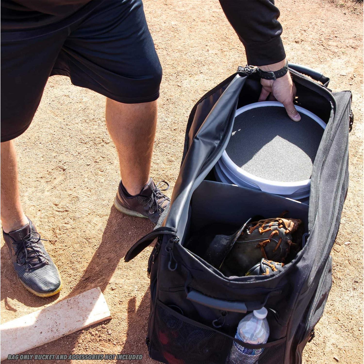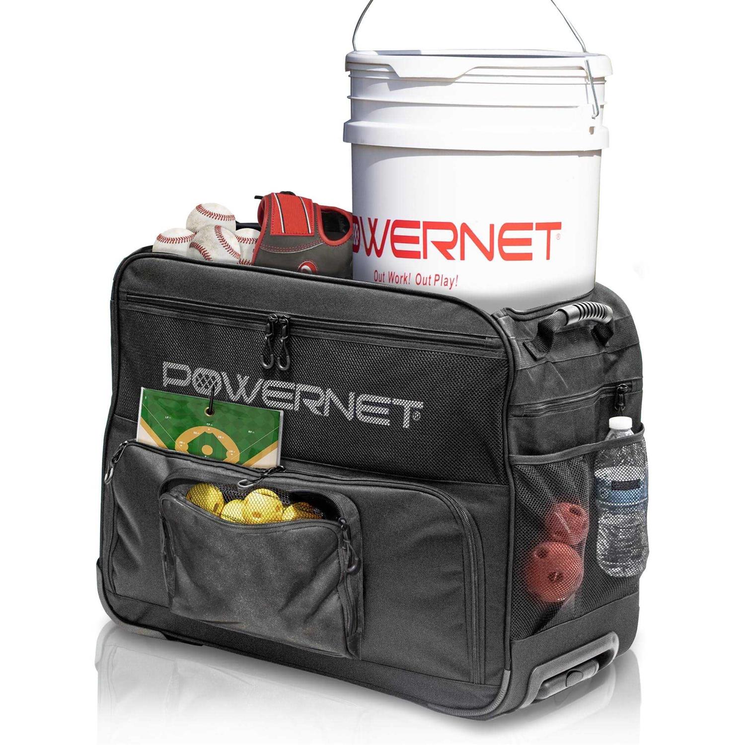 Transport training supplies and valuables to games and practice with the PowerNet Baseball Bucket Bag. This extra-large equipment bag holds 2 6-gallon buckets or caddies provides a comfortable haul across parking lots, fields, and fits in most cars, trucks or SUVs. Buckets are separated by removable shelving for larger equipment when needed. Wrapped in a durable all weather material that is both wear and tear resistant and built to remain intact throughout the seasons. The base features a dual stabilizing rail system with reinforced plastic for heavy loads. The bag features 10 additional pockets and storage areas, including felt-lining to protect valuables and mobile devices from damage and scratches. The easy pull telescoping handle with the rugged all terrain rubber based wheels make it easy to navigate on any surface. Stay organized and prepared with the all-in-one coaches pick PowerNet Baseball & Softball Bucket Bag.