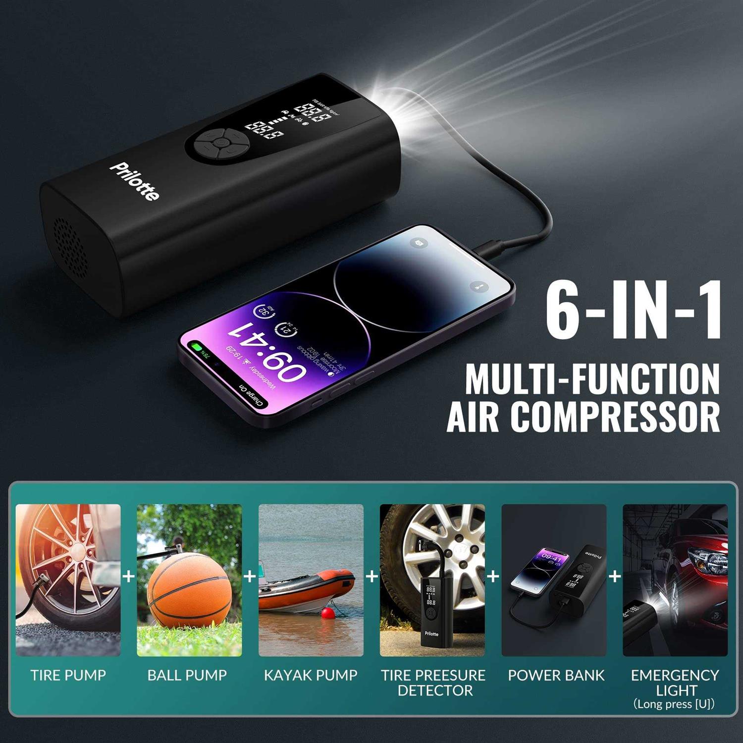 Prilotte Tire Inflator Portable Air Compressor-Upgrade 20000 mAh Air Pump for Car -150 PSI Electric Tire Inflation-Cordless Tire Pump with Pressure