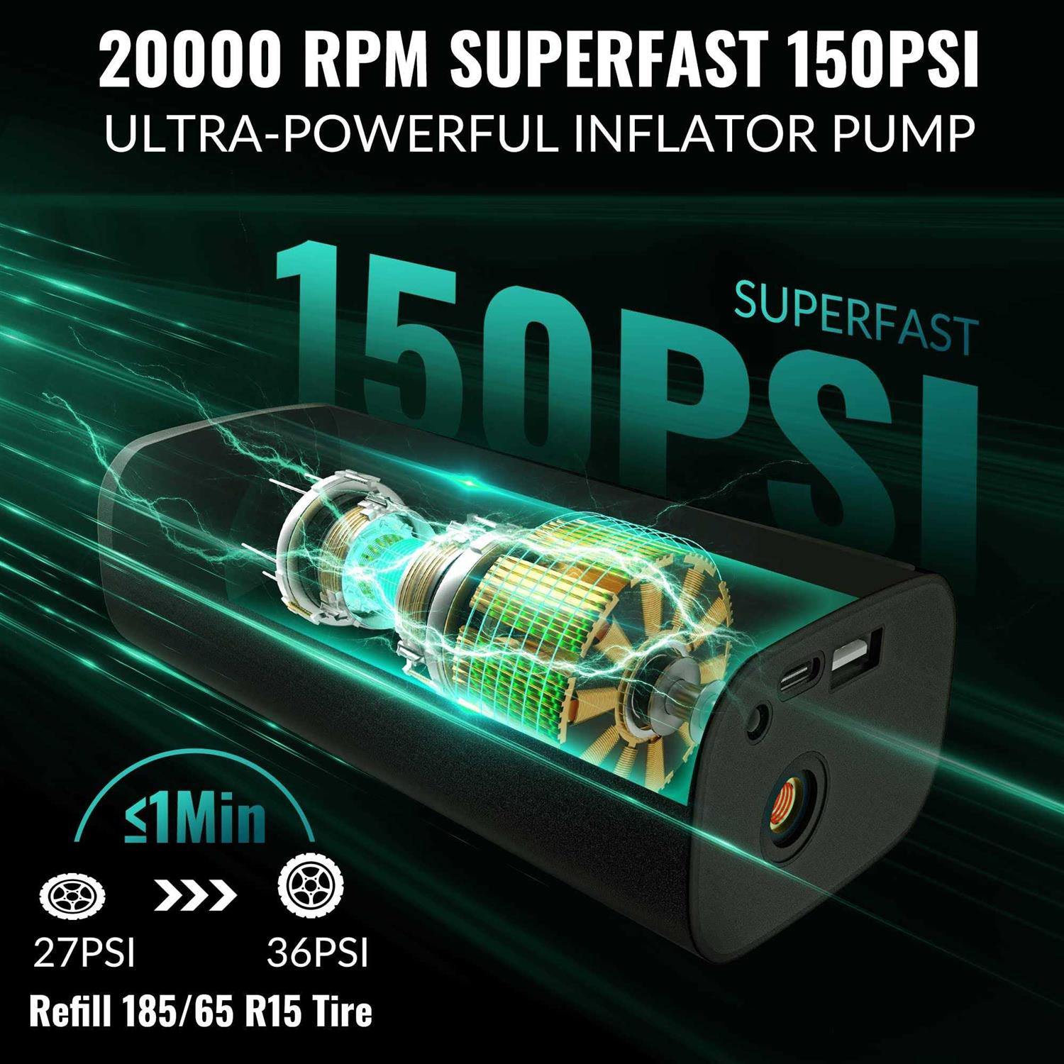 Air Compressor – Equippedwith 20000mAh rechargeable upgradable battery. It can be used without connecting a cable . 1-2 hours of continuous operation. Ideal for inflating cars, motorbikes, bicycles, balls and other inflatables. Charges for 3s to power up before First use. Tire Inflator – 4 preset modes inflate cars, motorcycles, bikes and balls, and automatically stops when it reaches the preset value, making it easy for beginners to use. Manual mode allows you to set the pressure value according to the object to be inflated, MAX 150PSI. Easy to operate, it can meet a variety of inflation needs. Portable Air Compressor – 16V Cordless Powerful Air Pump has a built-in high performance chip that inflates tyres quickly. It provides 34 L/min of airflow. Inflates small car tires (27-36PSI) in less than 1 minute.