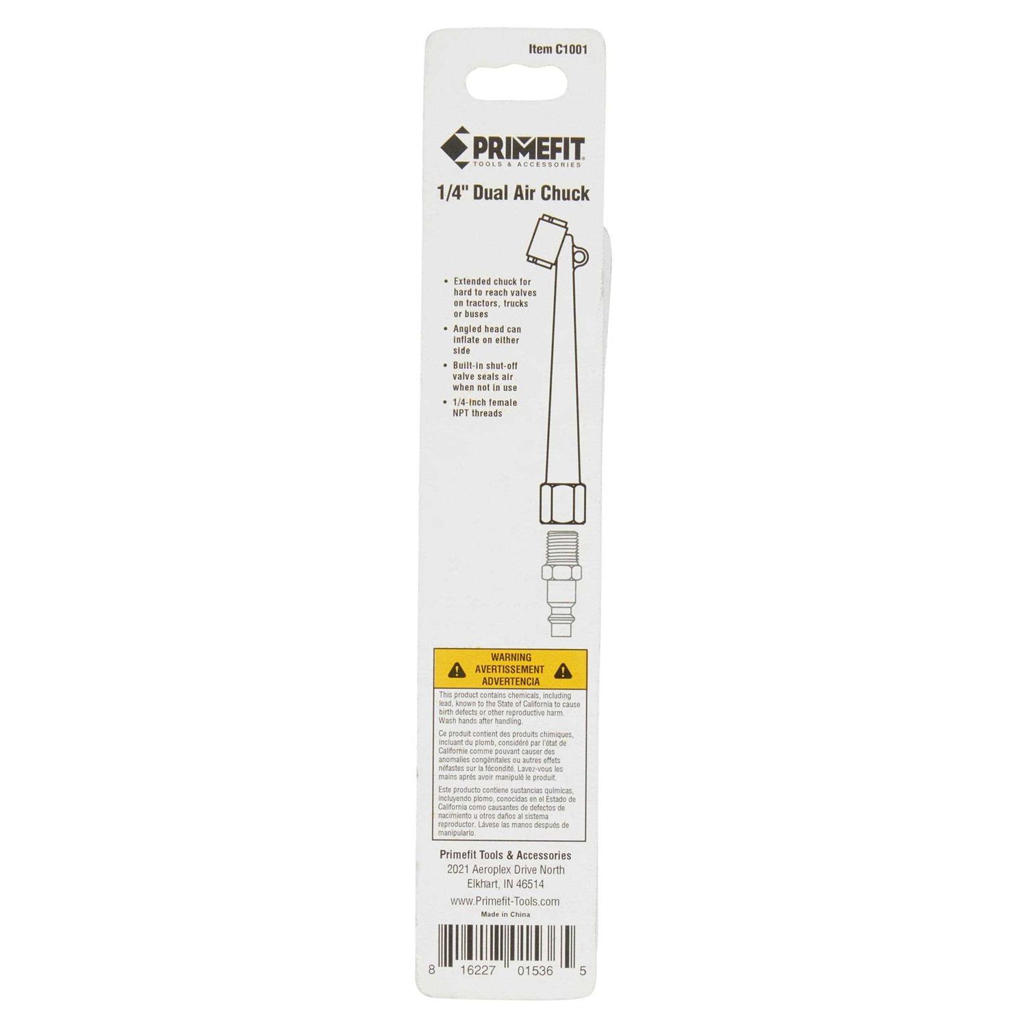 The Prime fit C1001 Heavy Duty Dual Zinc Air Chuck features dual inflationports so you can easily inflate a variety of tire styles, including difficultto reach values, such as bicycle and truck tires. This air chuck has a heavyduty, chrome-plated zinc construction and 1/4-inch NPT female threads. ThePrime fit C1001 Heavy Duty Dual Zinc Air Chuck comes with a 1-year limitedwarranty. Prime fit Inc. and its affiliated companies have been one of theleading global manufacturers of Pneumatic Tools, Air Accessories and Air Hosessince 1976. Prime fit produces a broad range of industry leading productsserving the Consumer, Automotive, Commercial and Jobsite pneumatic markets.