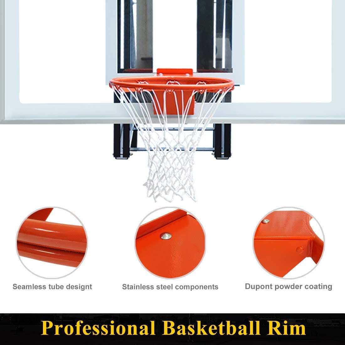 - Solid steel breakaway rim with single-spring action flex mechanism,which provides spring-back action and reduce pressure on the backboard.