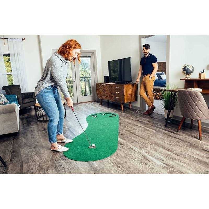 Putting Mats by PUTT-A-BOUT. Details:Hone your putting skills with this fun 3-by-9-foot putting green. The kidney-shaped green’s three cup cutouts give you plenty of practice targets, while the built-in sand traps are designed to catch missed shots. The Par 3 Plus model comes with deeper cutouts. The green also offers a high-quality putting surface designed to stay smooth over time. Perfect for golfers of all skill levels – beginner or pro. Great gift for Father’s Day, Mother’s Day, Graduation, Anniversaries, Weddings, Birthdays, Christmas, and more!