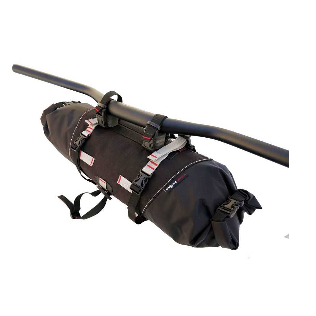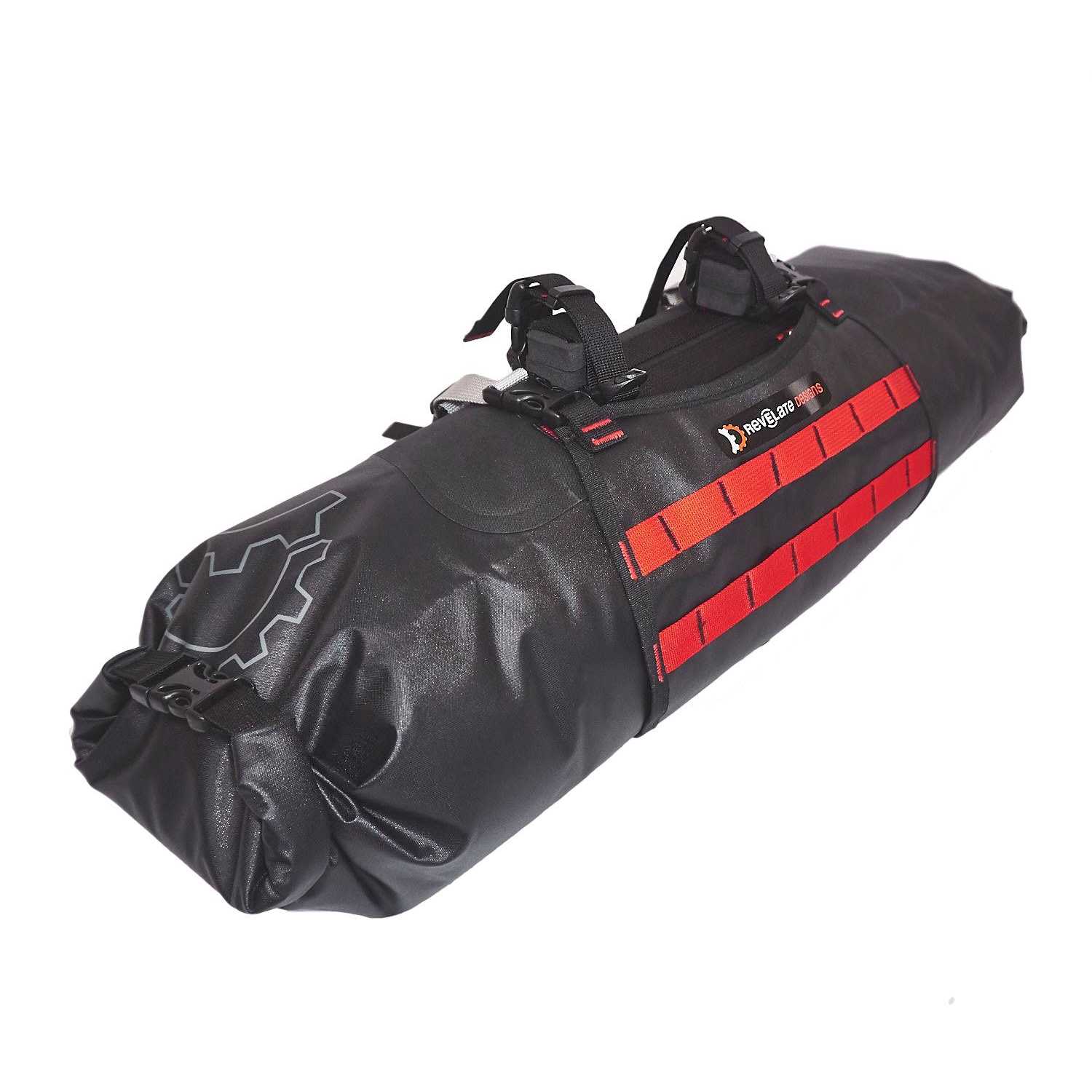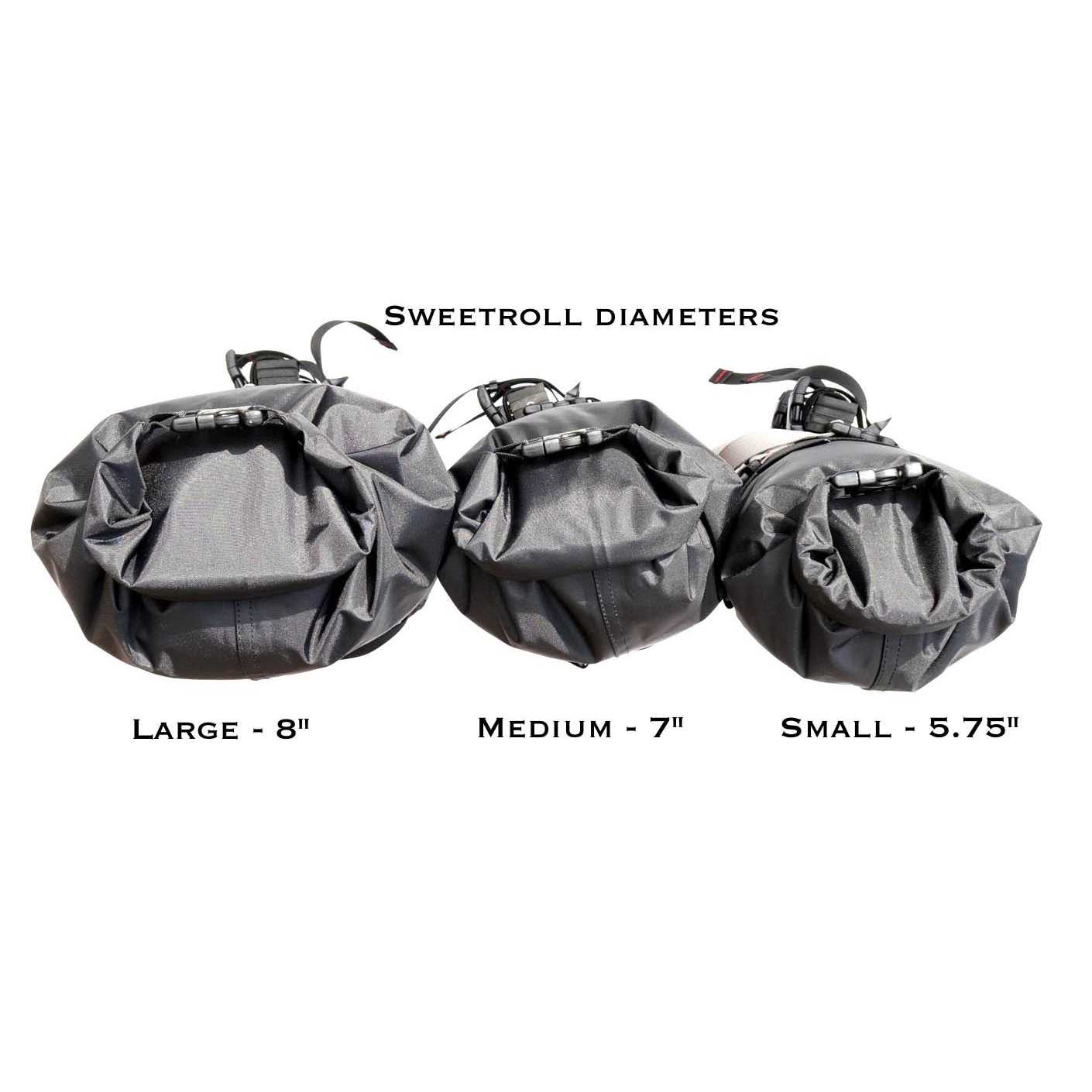 The Sweetroll is our standalone, 100% waterproof, bikepacking handlebar bag. It’s highly versatile with dual side roll down closures that allow for a wide range of load carrying options. The modular front system integrates with our front pockets for additional storage. Sweetrolls are built with radio frequency welded seams. Waterproof RF welded construction. Adjustable stacking spacers offset the Sweetroll from the handlebar and prevents cable and lever interference and bag abrasion – An original Revelate Designs innovation. Manta Flap – Shove stuff between the flap and the main bag. Features two rows of daisy chain webbing for custom configurations. Swap it out for a pocket for added capacity. Fiberglass cross stiffener adds rigidity to the mounting area and provides structure when packing and unpacking. Thick EVA foam spacer block at the head tube prevents abrasion and bag wear against bike frame.
