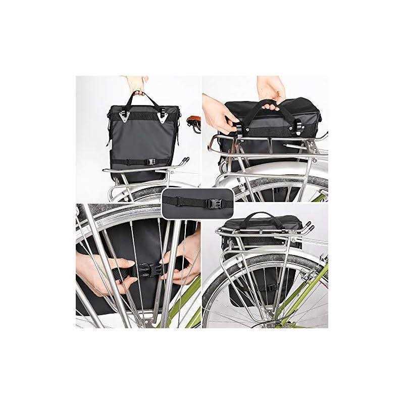 Material:Made of 1000D polyester material with waterproof PVC layer on both sides, this bike pannier is super durable,as well as anti-tear, wear resistant and heat resisting, protecting your items perfectly 3 in 1 multifunctional bike rear pannier bag.(2 one side shoulder bags and 1 backpack)can be used independently,convenient for versatility! Bike Pannier Bag Easy installation:Quick release system, easy to be fixed on rear seat trunk rack High capacity: 1 backpack:19.2″in L*12″in W*5.8″in H.1 side shoulder bag:11.6″in L*5.9″in W*13.5″in H. Fully expanded to hold more Removable Shoulder Strap for one side shoulder bag: There is an adjustable nylon shoulder strap in the package, with easy locks on both sides, the strap can be installed and removed effortless, and you can carry the bike pannier on the shoulder while not cycling