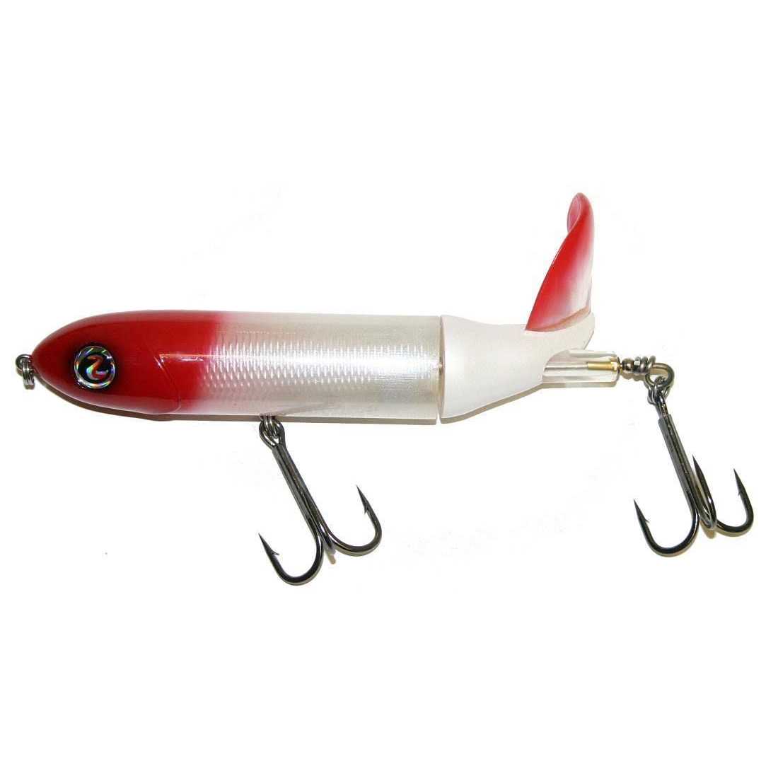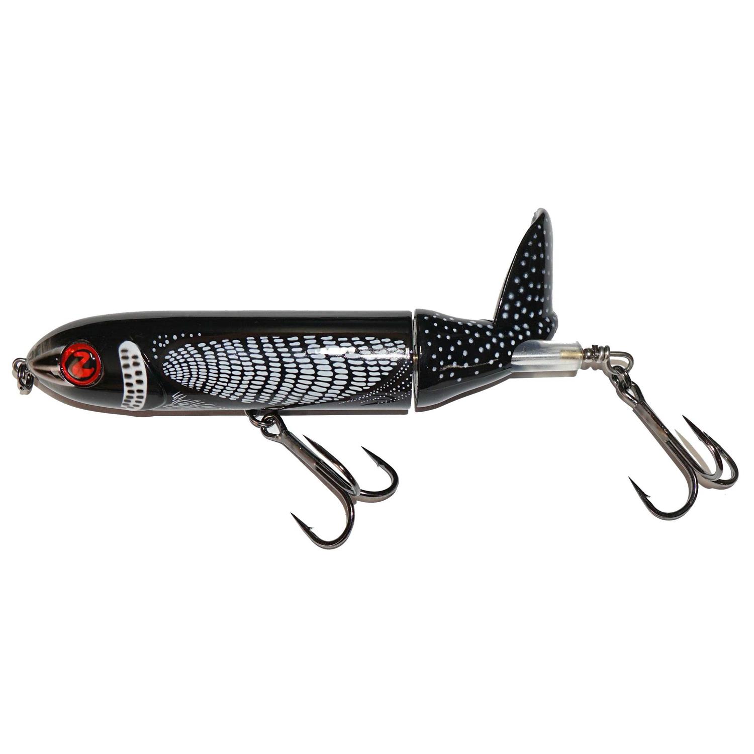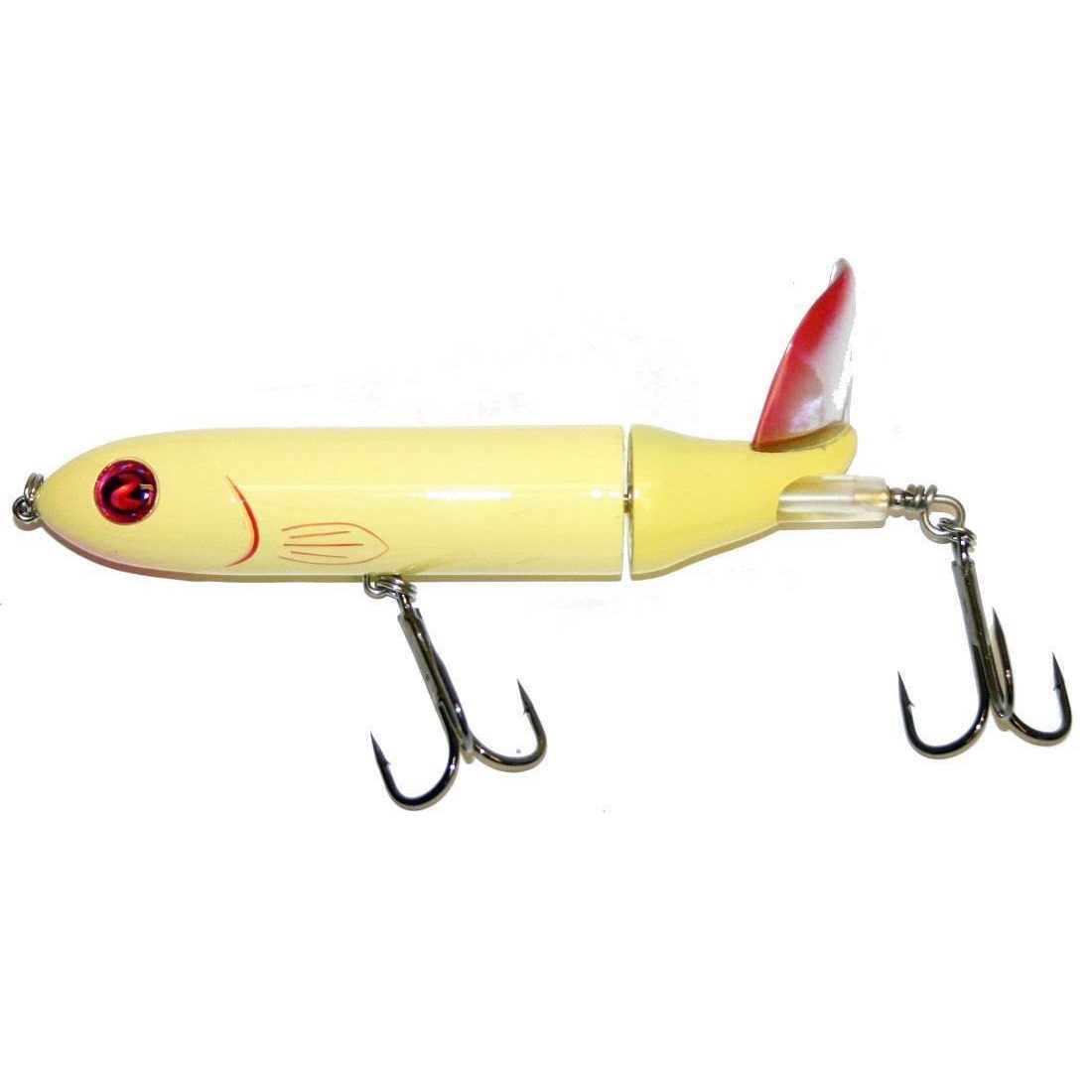 River2sea’s Whopper Plopper 190, designed by the legendary angler Larry Dahlberg, is his secret weapon for musky fishing. The soft, pliable tail rotates on the harness and creates muskie alluring rumbles at variety retrieve speeds and depths. The tail is designed to withstand the punishment rendered rocks, stumps and muskies. For decades savvy musky men have known that surface lures that made a certain deep throated hollow popping–plopping sound drove muskies crazy. The problem was if you found one with a “good” tail it would bend and get out of tune when it got bit by a fish, hit a rock or even just from repeat casting. I caught my first musky over 50 years ago on this type of lure and I’ve been tinkering with them ever since. The Whopper Plopper is the culmination of my years of fine tuning this style of lure and since they are molded, every single one comes out of the box with the perfect tail size and angle to make a sound that simply drives fish crazy. Plus, its tail is made of super tough plastic that flexes right back into place whether it gets chomped on or gets cast into a bridge piling. Weighing in at over 2 oz you can cast it a mile and it’s got top quality River2sea 5 ⁄ 0 hooks that will stick from long distance. The Whopper Plopper 190 is “roll resistant” and works well at a variety of speeds. Interestingly, sound experiments have suggested that even at constant speeds the tail kicks out sounds that vary as much as an octave in pitch as opposed to the more monotone metal tails.