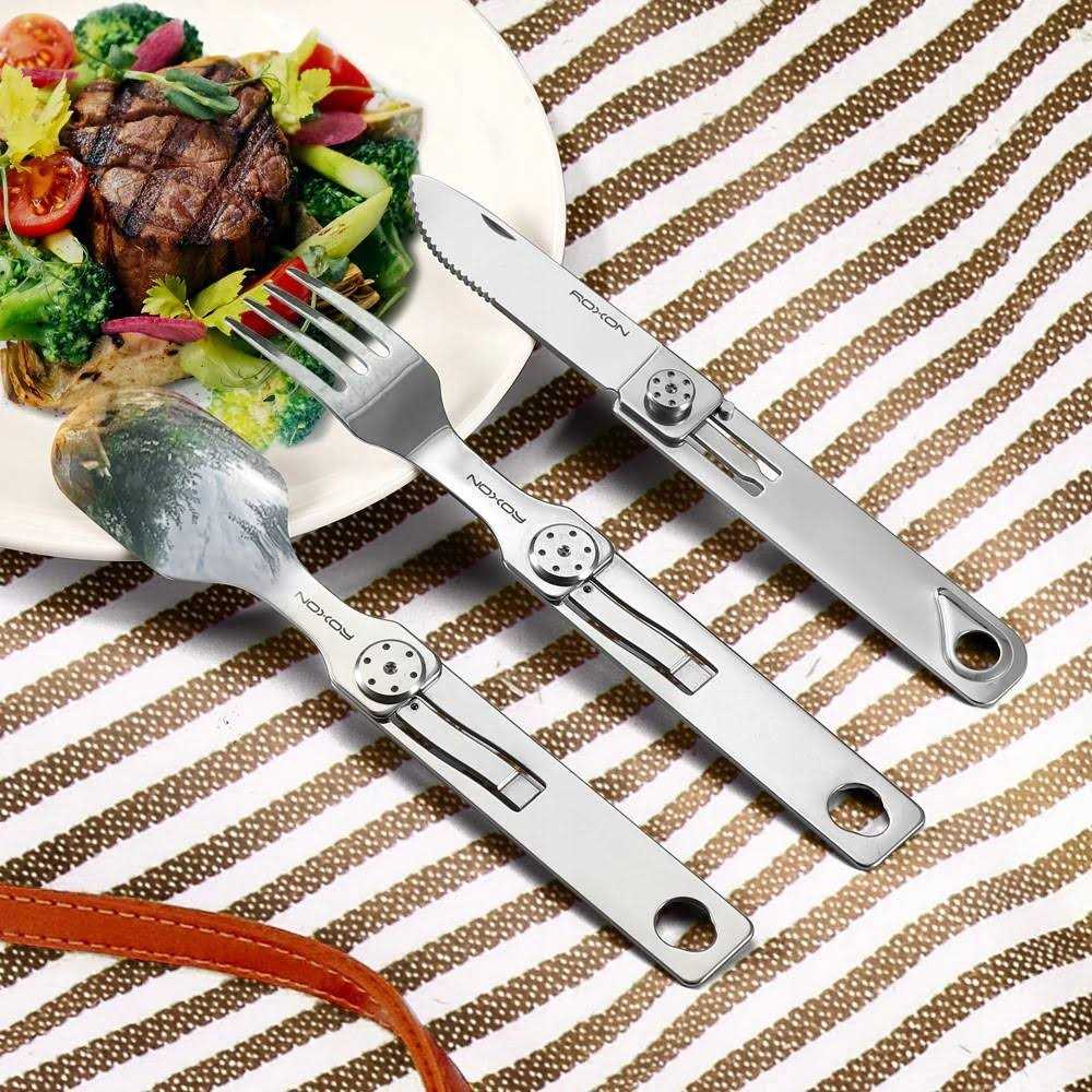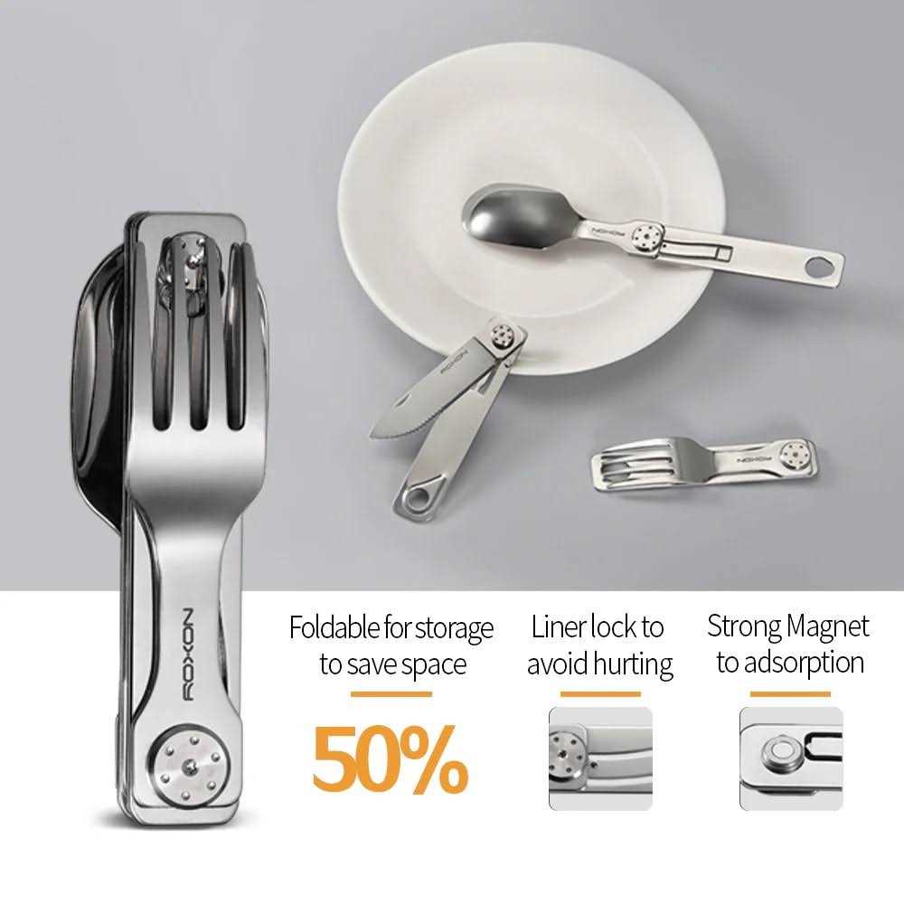 ROXON C1 3 in 1 Camping Detachable Cutlery Knife Spoon Frok for Outdoor Camping Hiking Read more Product Features stainless steel 1. COMPACT AND PORTABLE: weight only 107.5g, carry-on, specially designed for dining out 2. MAGNETIC AND FOLDING: folding design, save 50% space. Magnetic connect, simple operation. 3. 3 IN 1: round spoon, practical fork & serrated knife. Made by food grade stainless steel, durable. 4. Mirror polished, easy to clean. 5.