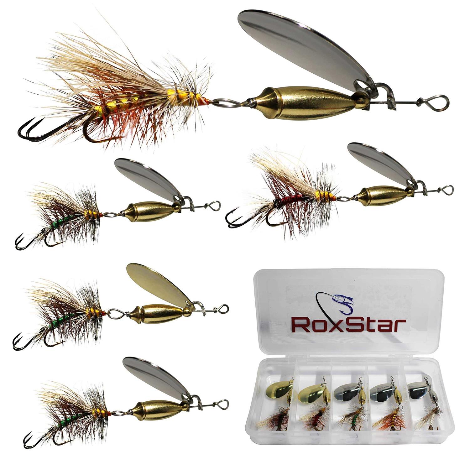 Spinners & Spinnerbaits by RoxStar Lures. Details:Welcome to the RoxStar Fishing! RoxStar Fishing was created by true anglers who share your same passion for fishing and the great outdoors. Our team of expert anglers have decades of experience fishing all around the world. Our RoxStar Fly Strikers have proven to be our best fishing lures for trout, bass, panfish and more. Our trout fishing spinners have the versatility to be fished at all depths to catch fish in any water condition. This Trout Lure Set Includes: 5 Different Fly Spinners from our Stimulator Strike Pack Series 2. 1x Green on Gold Spinner, 2x Green on 2-Tone Spinner, 1x Royal on 2-Tone Spinner, 1x Yellow on Two-Tone Spinner.