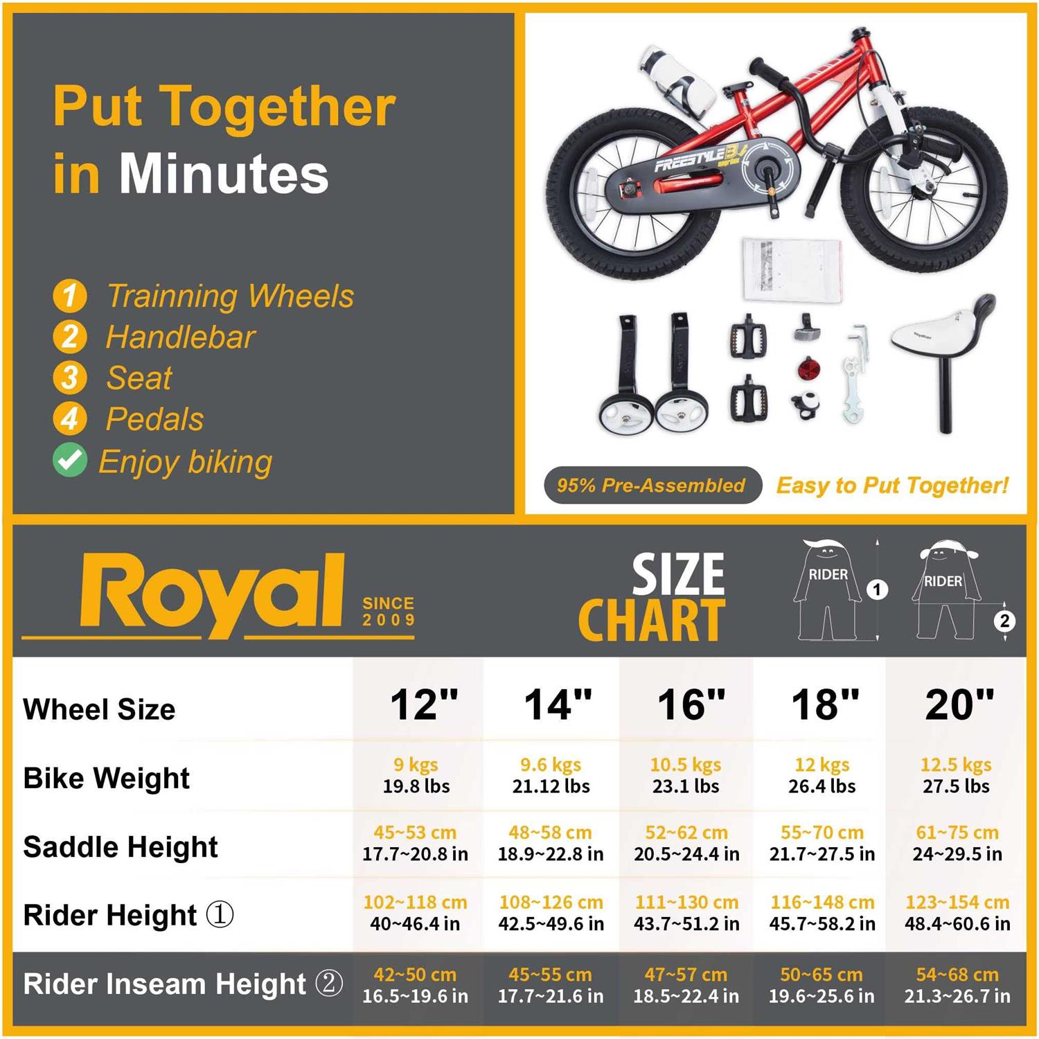 Brand: Royalbaby Color: Red Features: Sporty Design – RoyalBaby Freestyle kid’s bike was designed by inspiration from the BMX spirit, It’s all about fun, creativity, freedom, and friends. The sporty-looking is perfect for the next cycling star! Specifically For Kids – Each bike equipped with RoyalBaby patent sealed bearing for smooth pedaling. Training wheels come with 12/14/16 inch bikes, making it easy to maintain balance and learn to pedal even for young beginners. The water bottle and holder adds more joy to the ride. Fully adjustable seat and handlebar will give extra space when kids grow taller Safety – Shortest travel distance grips provides extra braking efficiency, sturdy steel frame and 2.4″ wide cylinder tires will accompany every adventure of your little one and bring them home safe and sound Easy Assembly – The bike comes 95% pre-assembled, with an elaborated instruction manual and all tools needed in the box. It is easy enough to put together in 15 minutes Always Reliable – RoyalBaby bike complies with the CPSC standards, and is trusted by millions of families in more than 80 countries globally. The most popular Freestyle kids bike offers factory direct sales with favorable retail price. Creative colors to choose for your little riders’ favor. EAN: 6975531564915 Package Dimensions: 38.7 x 22.4 x 7.1 inches