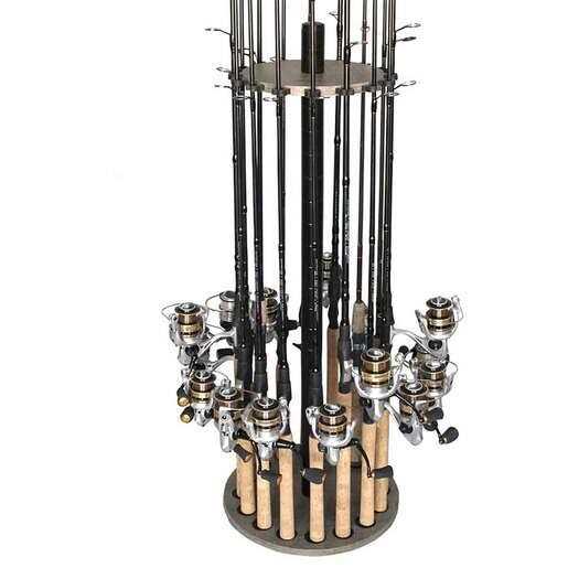 The Rush Creek Creations 16 Rod Round Fishing Rod Rack with Extension Post stands tall above all other storage racks. This sturdy, round fishing rod rack includes a 33mm powder coated steel center post and a bonus 6 inch extension for added height when storing larger rods. This rod rack keeps your gear secure with leveling base supports and 16 soft rod clips that adjust to most freshwater rod tapers. A sleek driftwood laminate finish makes cleaning easy and gives the rod rack a classic look that will fit in wherever your gear is stored.