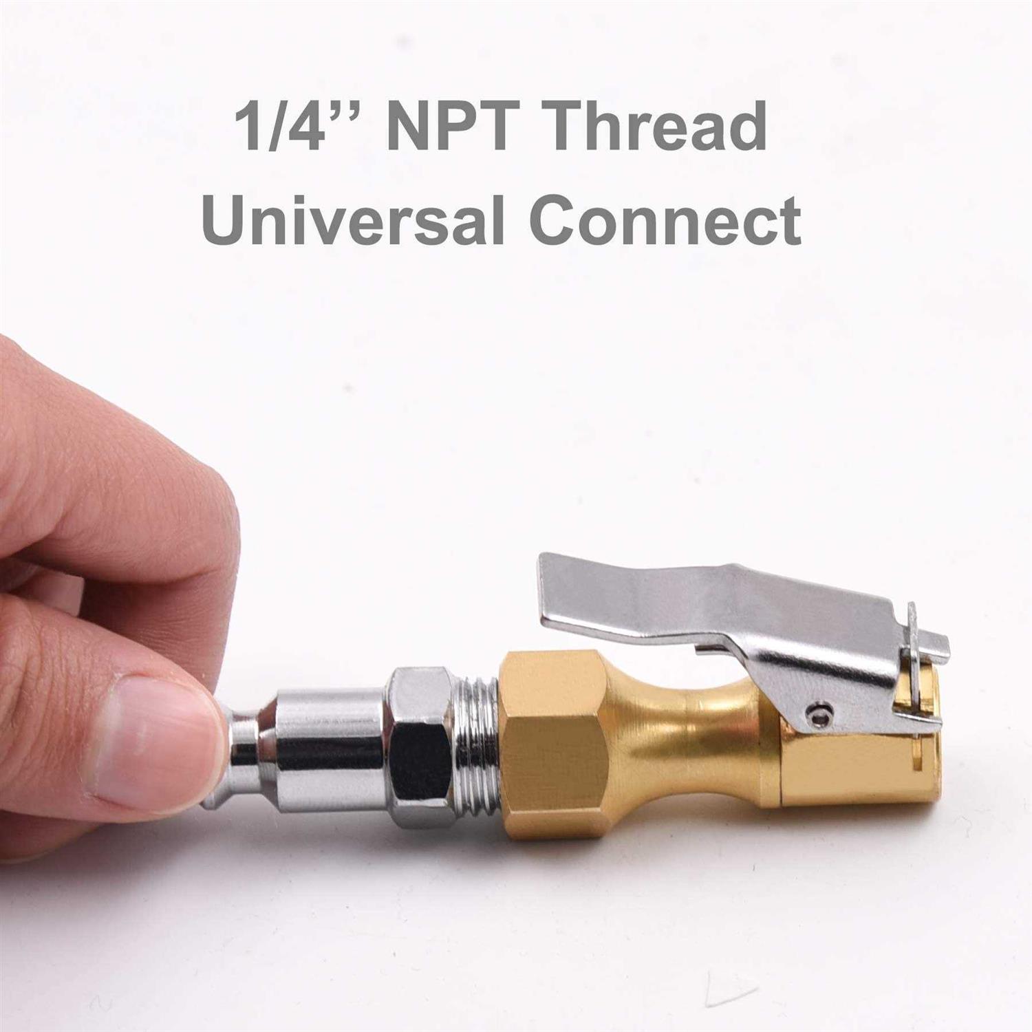 The Open Flow Air Chuck fits most inflators, but is designed specifically for use with AstroAI tire inflator gauges. The brass chuck design inflates tires easily, even on heavy-duty work vehicles thanks to a 250 PSI maximum pressure rating. There’s no need to thread the chuck to valve stems, because a locking clip securely seals the air chuck into place on a valve stem. A straight tip makes inflation hassle free. – 250 PSI RATED BRASS COMPONENTS are designed for heavy-duty use with tire inflators and gauges – COMPATIBLE WITH SCHRADER valves; the open flow design allows air to flow even when not engaged to a valve stem – FEMALE NPT THREADS fit most air inflators – HEAVY DUTY STRAIGHT TIP makes filling tire hassle-free; the locking clip keeps the chuck attached to the valve stem during inflation