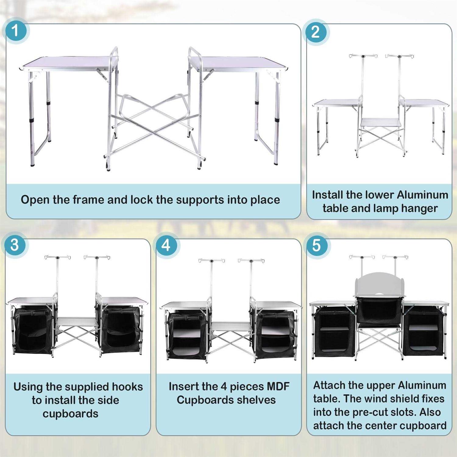 Suteck The camping kitchen table is easy to set up, folding and storage. The spacious design has plenty of space for all your cookware sets and food storage including 2 aluminum side tables, 2 layers of counter-tops and 3 zippered bags. The steel windscreens around the upper table ensure block the wind for heat retention and more effective burning. The camp kitchen station is easy to clean and portable. It’s the ideal choice for any environment such like the beach, park, garden,and other indoor and outdoor activities.