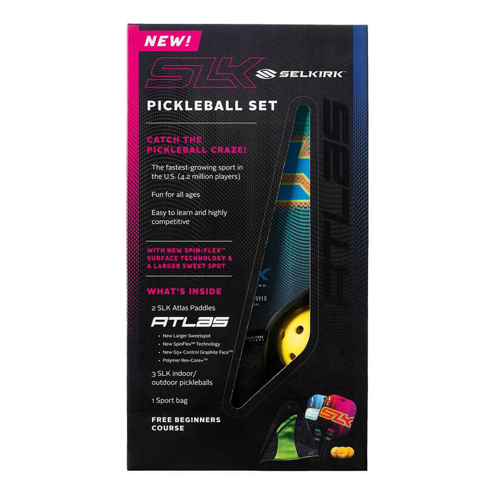 The all-in-one SLK Atlas Pickleball Paddle Bundle from Selkirk is the ideal set for both recreational and new players. It includes two paddles with indoor/outdoor pickleball balls, offering great value for those looking to dip their toes into the world of pickleball. Each paddle is equipped with the EdgeSentry edge guard for a well-balanced, solid feel without adding unnecessary weight, ensuring durability and improved performance. The revolutionary G5 Control graphite face is engineered for players who prioritize control, delivering a soft feel that allows for precision in every shot. Adding to its robust features is the SpinFlex textured surface, specifically created to enhance spin consistency and ball control, catering to players aiming to refine their technique. Polymer Rev-Core+ technology combines with a large sweetspot for consistent hits and a powerful feel every play. Finally, the SLK Ultra-Comfort Grip ensures a non-slip, cushioned hold, enabling players to maintain control and confidence throughout their game.
