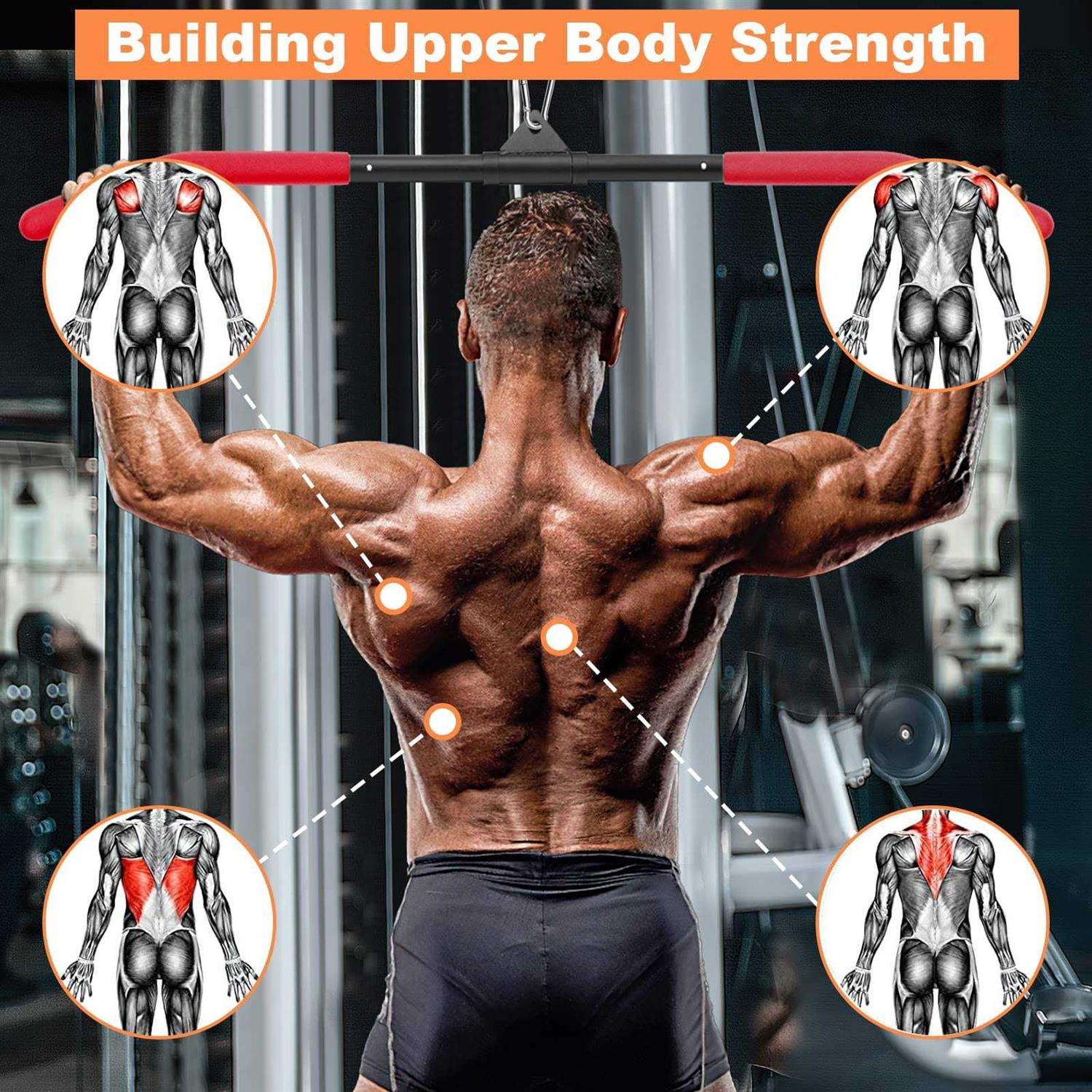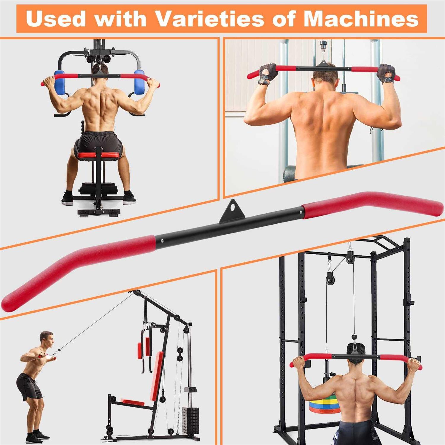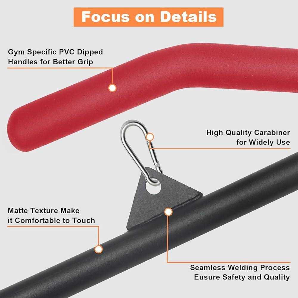 【Ideal Gym Equipment Attachments】 The lat pulldown bars is an ideal gym equipment attachment that can be attached to cable pulley system, gym machine, LAT Pull Down Machine, Squat Rack, Power rack and Weight machine. You can perform a variety of exercises such as pulldown, triceps press down, biceps curl, rowing workout, resistance training and etc. 【Build the Perfect Body Line】 The cable attachments for gym is designed to build strength and muscles in the upper body by focusing exercise on shoulders, back, lats, triceps, biceps and abs. Incorporate this bar into your home gym and start for your V-shape body! 【Premium Material】 The lat pull down attachment is made of high-quality Q235 steel and is welded and painted, which can prevent the bar from wear and tear during training and allow it to load up to 330 lbs to meet various training requirements. 【Gym Specific Handles】 Use commercial gym specific PVC dipped handles that are wear-resistant and non-slip to provide an ergonomic, firm grip while enhancing comfort and safety during your daily workouts. 【What You Get】1 x 39.37 Inch lat bar, 1 x carabiner. The tricep press down Bar is detachable and can be easily assembled in minutes without any additional tools.