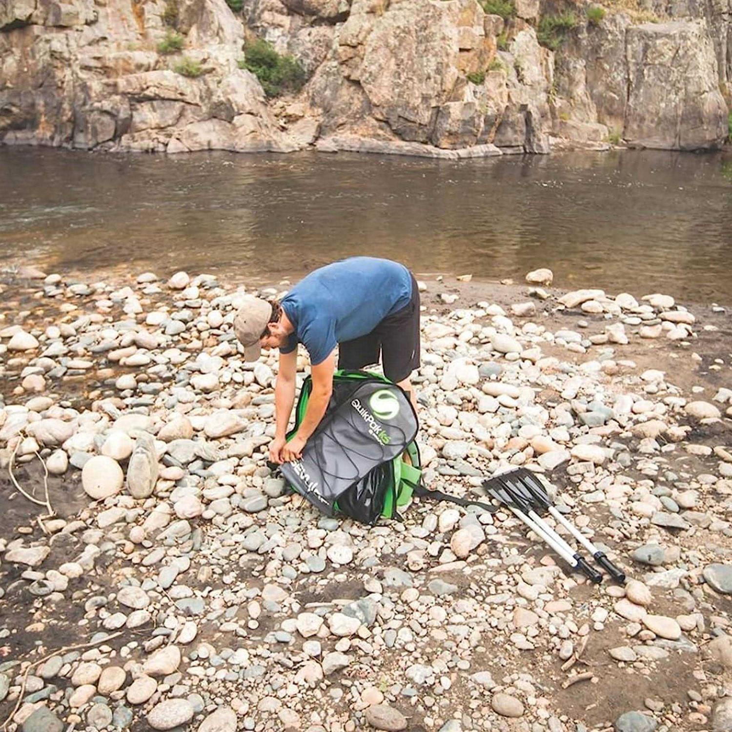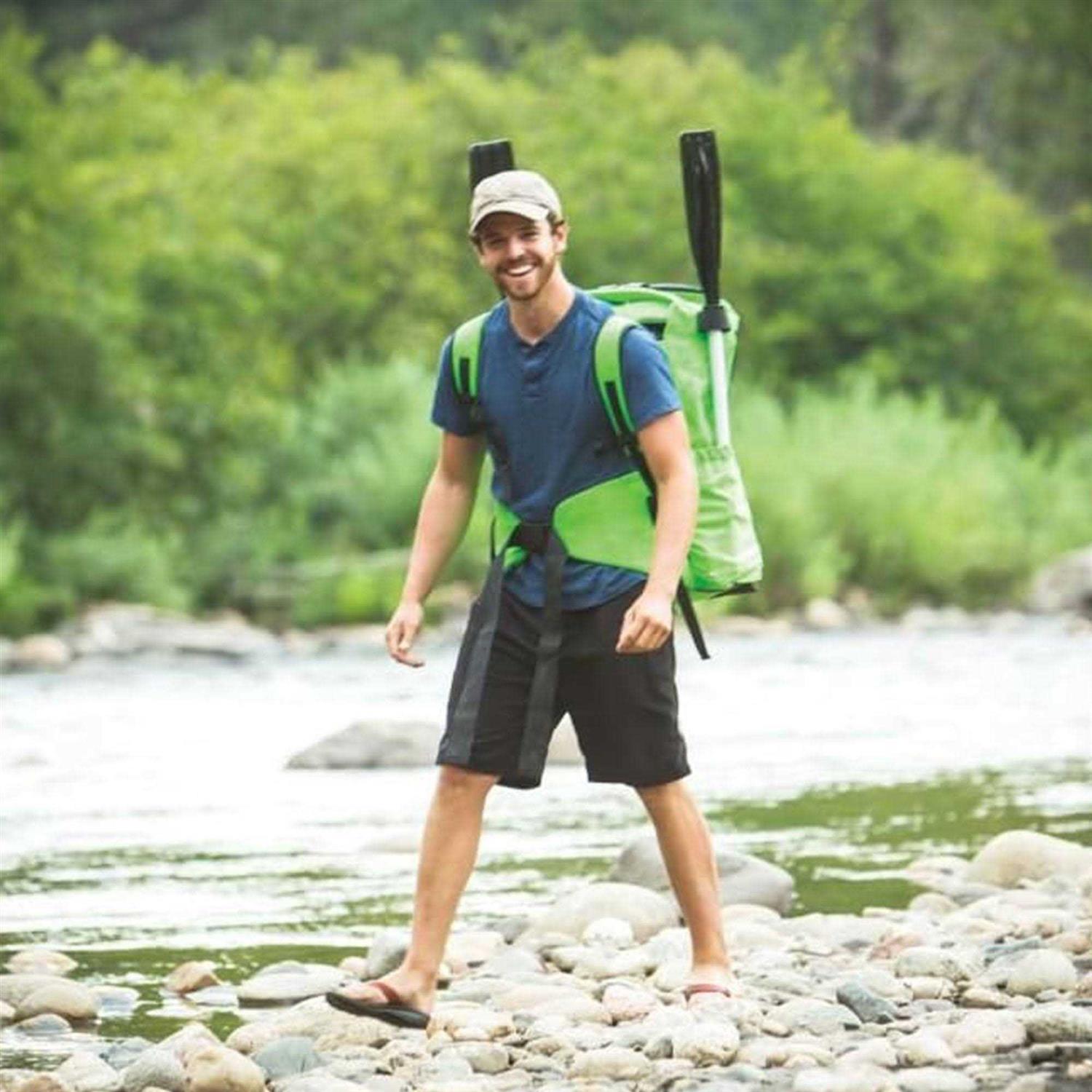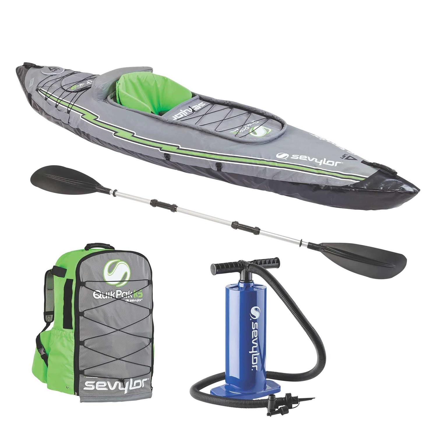 Hit the water in as little as five minutes with the Sevylor Quikpak K5 1-Person Kayak where getting to your next trek is as easy as backpack unpack kayak. The innovative backpack system carries everything you need to get going and ultimately folds out into your kayak’s seat. The 24-gauge PVC construction rugged tarpaulin bottom and thick polyester cover easily handle the rigors of the lake. Just in case you do hit a snag the multiple air chambers will help you get back to shore. Spray covers help keep you dry from splashed water. The D-Rings and bungee storage areas let you carry more gear on your trip that’s easily accessible.