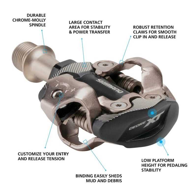The Shimano Saint PD-M821 Clipless DH SPD Pedals uses robust retention claws for serious downhill riding. Improved axle durability raises these thin and tough pedals to a new level. These pedals have a wide contact area gives you excellent control and has a low stack height to help avoid rocks and roots on the trails. The are four height adjustable pins per side for improved grip when not clipped-in. The pedal body protects binding mechanism against impacts. The robust retention claws provide smooth engagement and release. Adjustable entry and release tension settings. These are SPD Compatible. The pair weighs around 546g and comes with SM-SH51 Cleats.