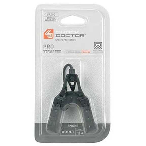 The Shock Doctor Pro Strapped Mouthguard features multi-layer construction with an internal shock-absorbing frame. This provides superior protection and a more comfortable fit compared to conventional mouthguards. The quick and easy boil-and-bite fitting offers a tight-molded gel feel. Classic Fit: traditional and original, all-around performer. It features a shock-absorbing bumper that deflects impact away from front teeth and shock-absorbing jaw pads that help protect against concussions and create a channel for improved breathing. Works with braces. Youth fits ages 10 and under, Adult fits ages 11 and over.