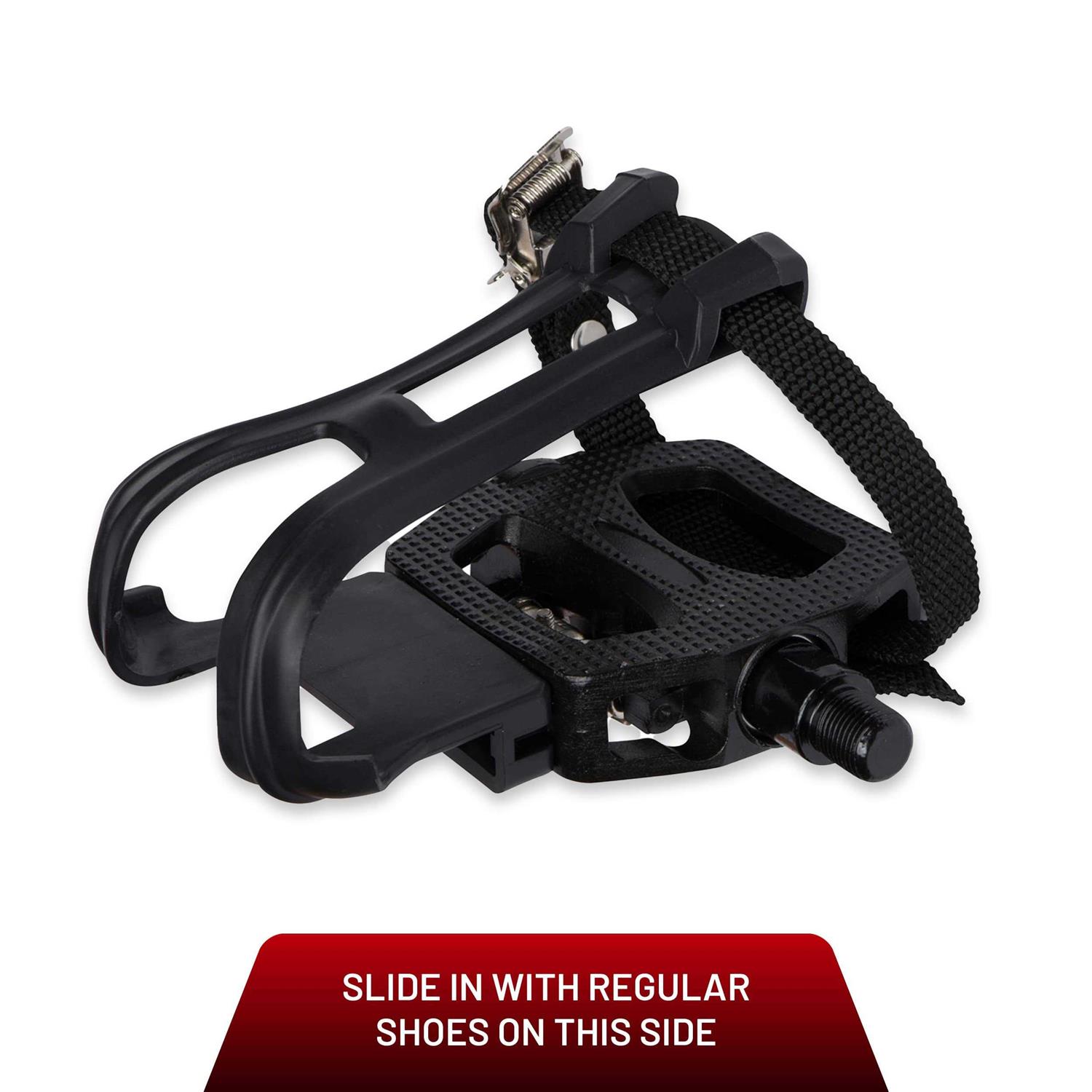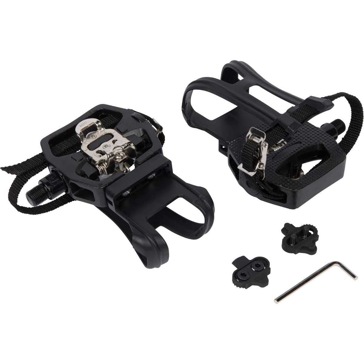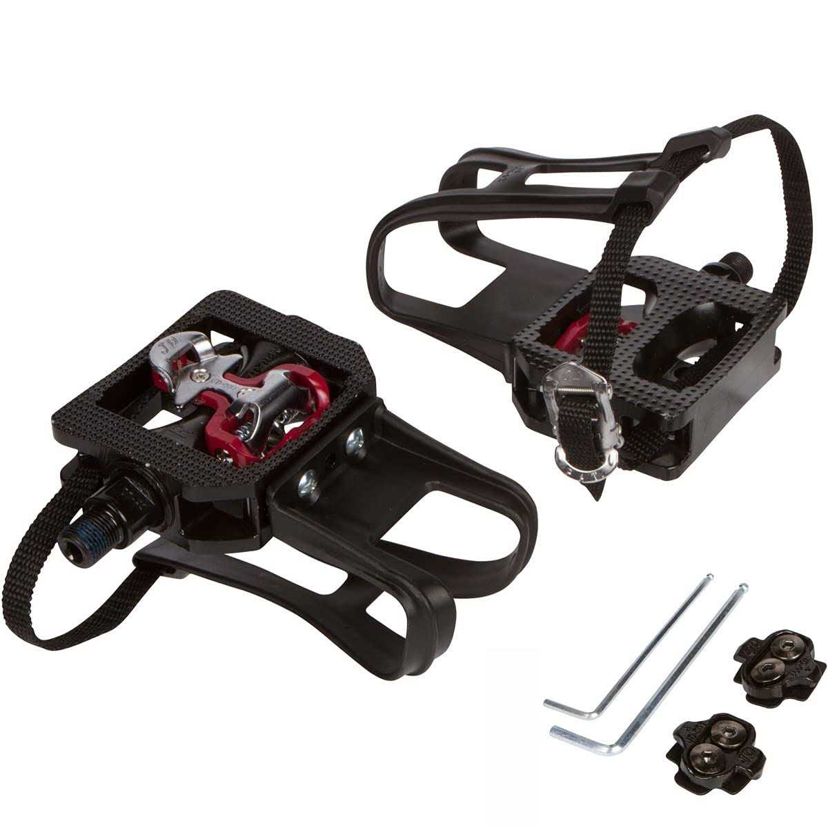 PACKAGE INCLUDES: 2 Dual Function SPD Pedals (9/16″) with Toe Cages 2 SPD Shimano Cleats 1 Allen Wrench 1 Instruction Manual Outfit your cycle bike with these 2-in-1 SPD pedals with toe cages. Clip into the pedals on one side with cycling shoes or slide into the toe cages on the other side with regular shoes. These pedals provide maximum versatility so the whole family can use the bike, no matter the shoes they have. Rather than having to buy new cycling shoes compatible with Look Delta pedals on the Peloton for example, swap out those pedals for this 2-in-1 option and keep your existing SPD compatible shoes that are used on most bikes and at most cycling studios ️ 2-in-1 FUNCTIONALITY – Pedals feature SPD clips on one side and a toe cage on the other side. Use with SPD cleats or flip over and use with regular shoes, providing maximum versatility SPD CLEATS INCLUDED – Pedals come with a bonus set of SPD cleats so you can make sure your cycling shoes are compatible and ready to go. Pedals will work with cycling shoes that already have SPD cleats installed FULLY COMPATIBLE – These pedals work for any bike with a 9/16″ spindle including popular bikes like Peloton, NordicTrack, Sunny. Compatible with virtually all indoor exercise bikes! EASY TO INSTALL – Instructions included on easy installation process. Pedal set comes with Allen wrench to screw in SPD cleats. Tension on the cleat can also be adjusted for the perfect fit ENHANCE YOUR BIKE – With these pedals anyone can use your bike, whether they have cycling shoes or not. If you already have the popular SPD cycling shoes, you no longer need to buy new cycling shoes for other cleat styles like Look Delta for the Peloton