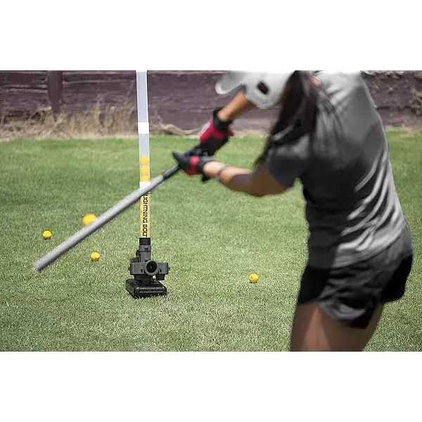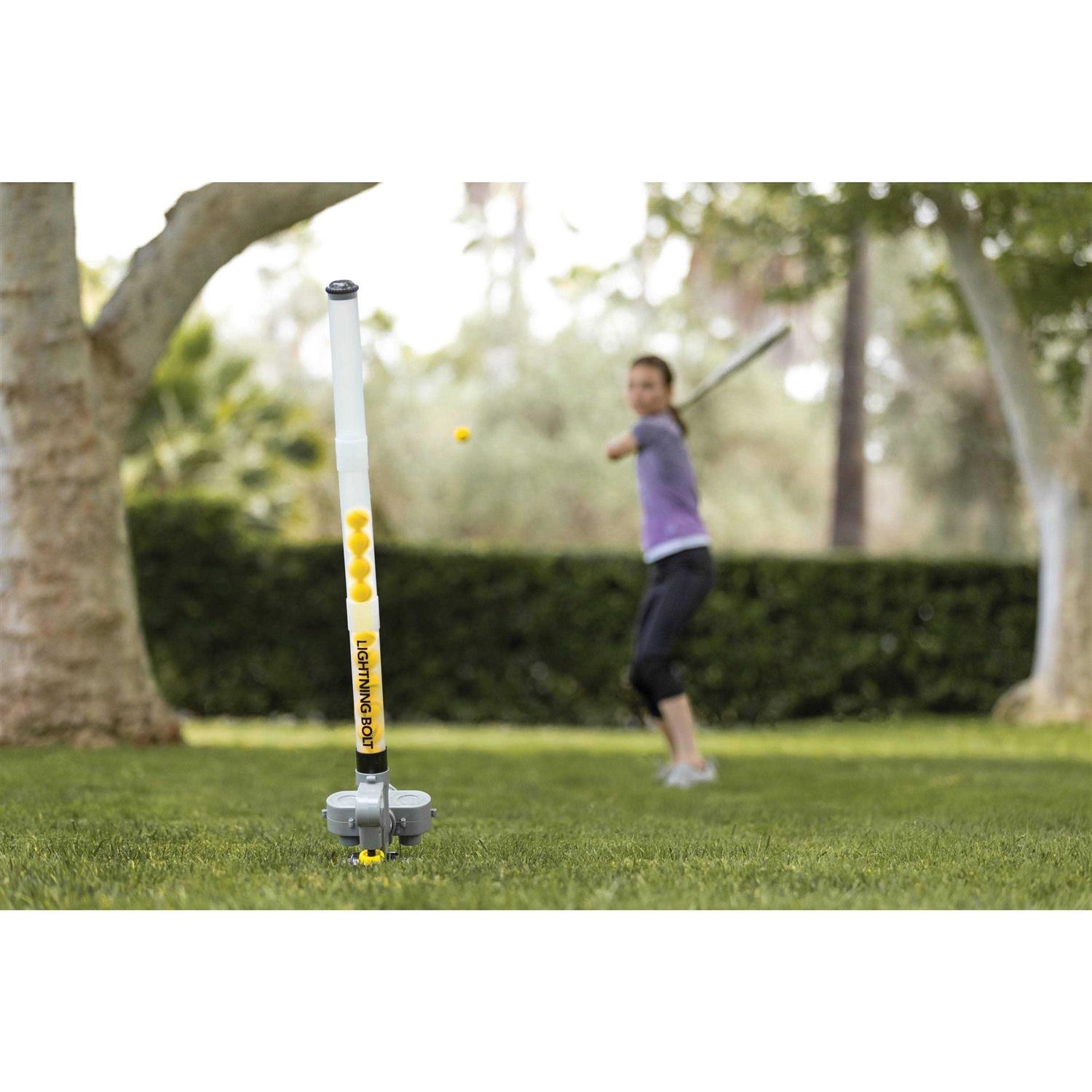 The Lightning Bolt pitching machine is a lightweight, portable and fun training tool designed to improve contact at the plate. Through focusing on soft micro balls, batters work on the visual processing, concentration and hand-eye coordination that make hitters great. Adding a Quick Stick bat increases the challenge for even the most experienced ballplayer. Color: Black. Age Group: Adult. Dimensions: 5 feet length x 11 feet width x 3 feet height.
