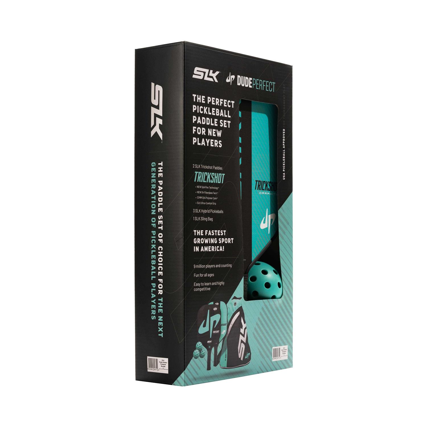 The SLK x Dude Perfect Trickshot Bundle combines everything you need to start playing pickleball! 1 SLK x Dude Perfect Sling Bag, 2 SLK x Dude Perfect Trickshot SLK pickleball paddles, and 3 SLK x Dude Perfect Hybrid Picklballs.