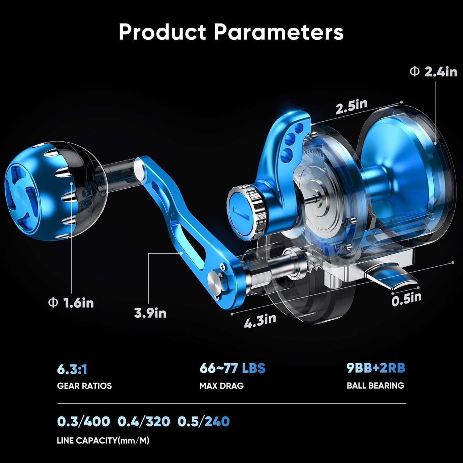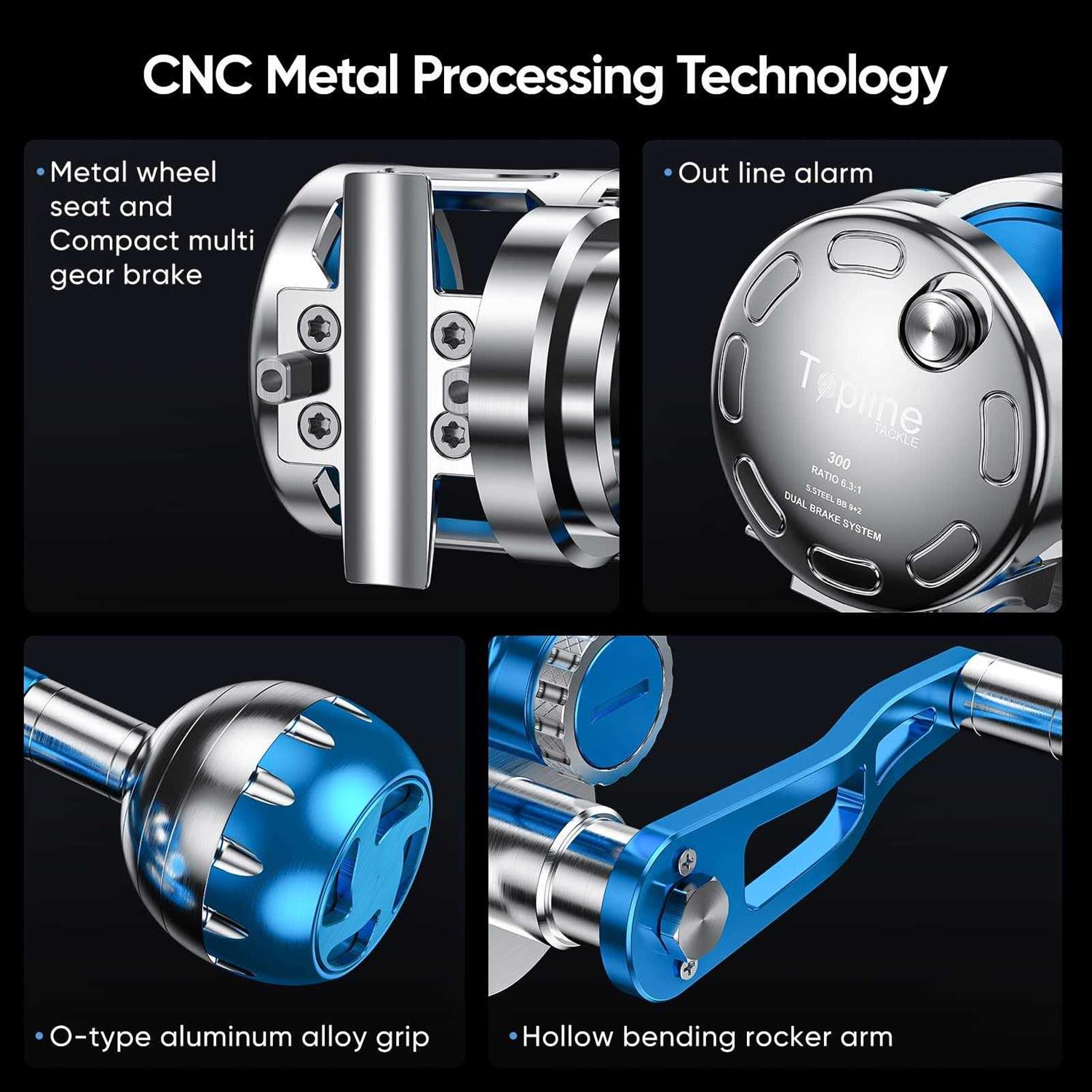 All metal aluminum alloy CCNC metal processing technology professional saltwater slow pitch jigging reel. Bearing: 9BB+2RB high density high-speed stainless steel anti-corrosion and durable. Gear ratios: 6.3:1. Max Drag: 66lb/30kg-77LB/35KG.Line Capacity:30lbs/437yds-30lbs/546yds Ergonomic design Chis multiplier drag jigging reel uses new lightweight hollow aluminum alloy bending rocker arm for taking-up more easily. O-type aluminum alloy grip: High quality of Topline Tackle slow pitch jigging reel with new type of aluminum alloy ergonomic design O-type grip has a pattern on the grip which can not only prevent slip but also have a full metal grip feeling. Function CPre-set lever drag features for accurate drag setting shielded and treated stainless steel ball bearings that allow for super-smooth operation marine level anti-corrosive components that allow for years of use.the wheel seat is fixed with 4 stainless steel screws more conducive to the full performance of the brake and control.the spring-loaded out line alarm system can remind the fish in time and accurately so as to better experience the fun for fishing. Scope of application C With ultra-high line capacity for saltwater fishing big water or big fish. A perfect fishing jigging reel for striped bass tuna redfish snappers flounder and other saltwater species. It has been operating in the field of fishing gear for 20 years. The main outdoor fishing gear products mainly include: fishing rods fishing reels fishing baits fishing lines fishing floats fishing tools and many series of products. Product Description: Gear ratios: 6.3:1 Max Drag: 66lb/30kg Ball Bearing: 9BB+2RB Line Capacitymm/M: 0.3/4000.4/3200.5/240 Color: Blue and silver Product size: 20.5*11.5*9.6cm Product gross weight: 0.73kg Model: Right hand Material: Stainless Steel Aluminum alloy