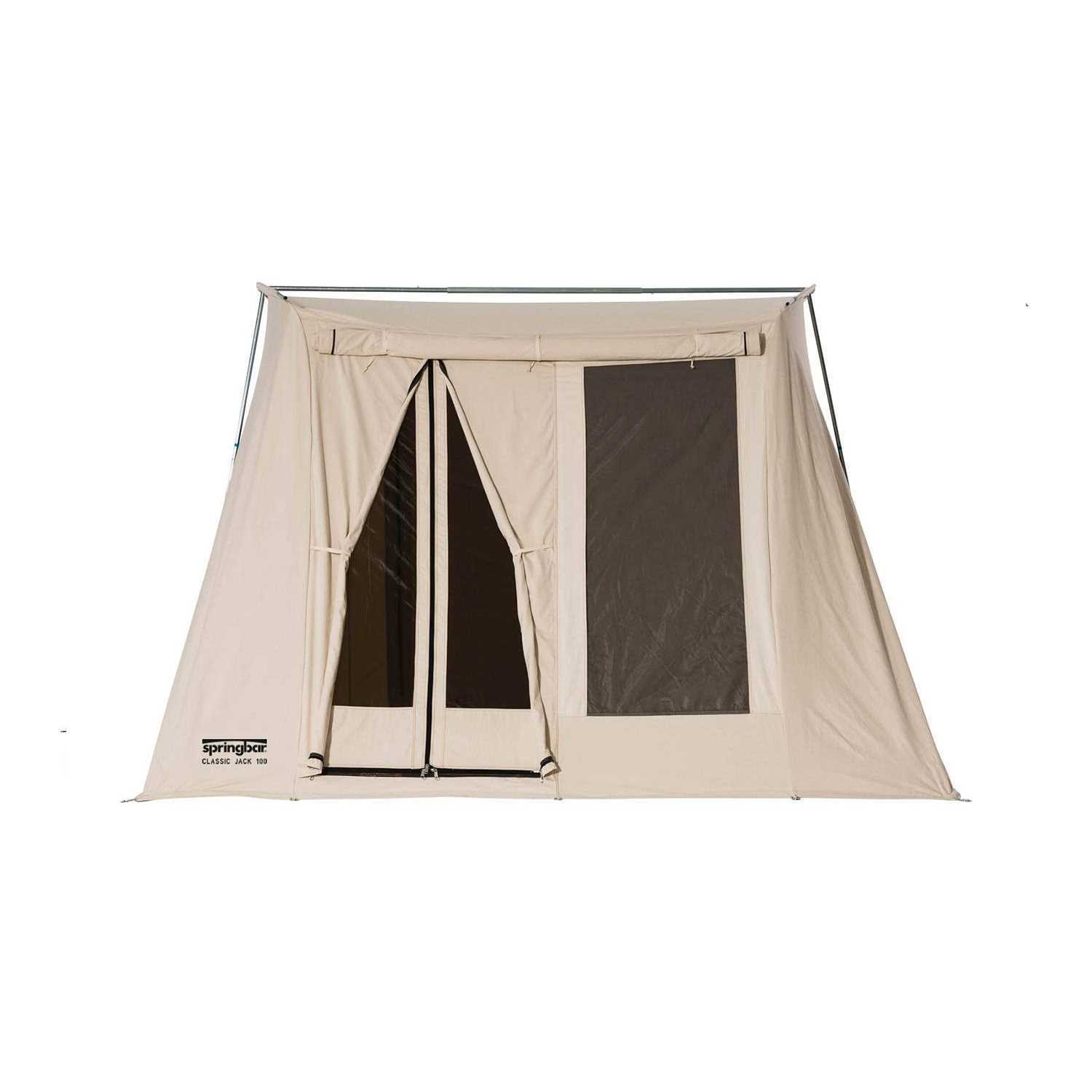 New for spring 2018, the Classic Jack 100 is a premium take on the 10′ x 10′ Springbar Tent footprint. Featuring our 10oz cotton duck canvas throughout in a creamy natural color, the Classic Jack is equal parts rugged performance and timeless style. Additional details include stretch interior pockets, brass cord locks, and 10oz cotton duck canvas carry bags. From rugged base camps to styled out backyard retreats, the Classic Jack is fit to the task. Features & Specs Original Springbar Design—Since 1961. Learn More 10′ x 10′ Footprint, 6½ Feet Interior Height, 100 sq. ft. Living Space. Spacious for 2, Comfortable for 4, Maximum of 6 Occupants 100% Cotton Duck Canvas (10oz Roof & Walls) Finished for water repellency & anti-mildew. Watertight in the rain, breathable for interior comfort, and highly durable. Learn More Easy & Simple One Person Set Up. Watch the Video Heavy-Duty Waterproof 14oz Laminated Vinyl Floor Galvanized Steel Pole Set, Solid Steel Zinc Plated Spring Rods, 12-inch Steel Nail Stakes Steel Wire Stake Loops with Perimeter Rope Reinforcement—Incredibly Strong and a Hallmark of Springbar Tent Design Large Windows, Door, and Ventilation Zones with No-See-Um Mesh Weight: 80 pounds. Packed Dimensions: 4 x 1 x 1 Feet. Learn More Imported Design Heritage: Designed by Jack Kirkham Sr. in 1961 to meet the growing popularity of car camping in the American West, the Springbar Tent is an icon of mid-century camp design. By utilizing the flex and tension of steel spring rods, a Springbar Tent can be pitched in just a few minutes, is exceptionally reliable is harsh all-season weather, and has a spacious and roomy interior. Enjoy a vintage look with performance and comfort ideal for the modern car camper. Learn more about Springbar History here. Materials: Springbar Highline Series Tents & Classic Jack Series Tents feature a tightly woven 100% cotton duck canvas finished for water repellency and anti-mildew. Springbar Tents are watertight in heavy rain, quiet in the wind, and breathable to eliminate mugginess. Three separate types of thread and lap-felled seam construction prevent leaking and water wicking. Although heavier than synthetic materials prevalent in tent making today, the interior comfort of a Springbar canvas tent is unrivaled. Learn more about camping with canvas here. Craftsmanship: Springbar Highline Series and Classic Jack Series tents must meet strict quality standards that are derived from a half-century of experience and refinement with the Springbar Tent design. The Highline Series of Springbar Tents is the result of years of collaboration with Jack Kirkham Jr. to deliver a quality tent that is built to perform and to last.