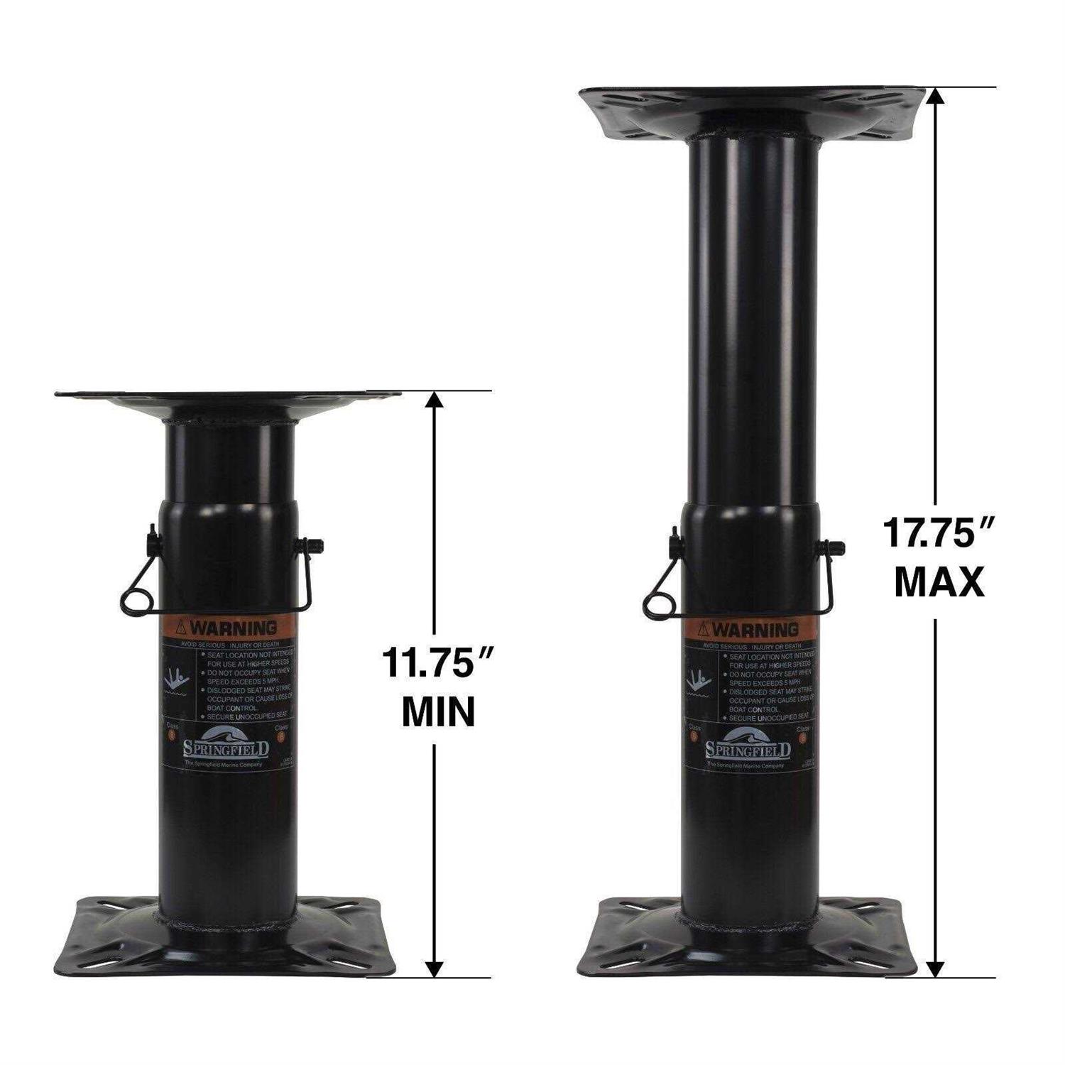 The SPRINGFIELD Adjustable Steel Pedestal is all you need to mount your boat seat at a height that is right for you! The pedestal stands at a minimum height of 11.75 inch and raises in 2-inch increments to a maximum of 17.75 inch. Designed to fit most standard boat seats, the pedestal has an integrated square base and mount plate outfitted with slotted bolt patterns for easy installation. The rugged, all-steel construction features a black e-coat finish for ultimate corrosion resistance and protection against harsh marine conditions. This pedestal is designed for small boat applications and is not intended for use at speeds exceeding 5 mph.