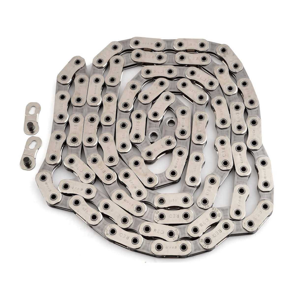 The all-new Sram Red chain was redeveloped from the ground up The unique link shape allows the chain to be narrower and lighter while increasing strength and providing more space between the outer plates of the chain and the cogs on either side. Result a quieter chain with faster more precise shifts. Features Flattop technology enables a narrower chain with quieter operation and increased strength and durability. Hard Chrome plated inner link plates and rollers for reduced wear and prolonged life. HollowPin construction for increased strength and efficiency. Real weight 250 g. Technologies PowerLock Sram chain engineers developed PowerLock as a tool free sure and consistent way to connect their chains. While PowerLock does not require special tools for install the especially tight tolerances of 10- 11- and 12-speed drivetrains mandate that each PowerLock is good for a one-time application only. Flattop To enable X-Range gearing technology Sram developed a narrower chain. The unique link shape of Flattop technology not only allowed for a wider gear range but also results in quieter drivetrain operation and increased chain strength and durability.