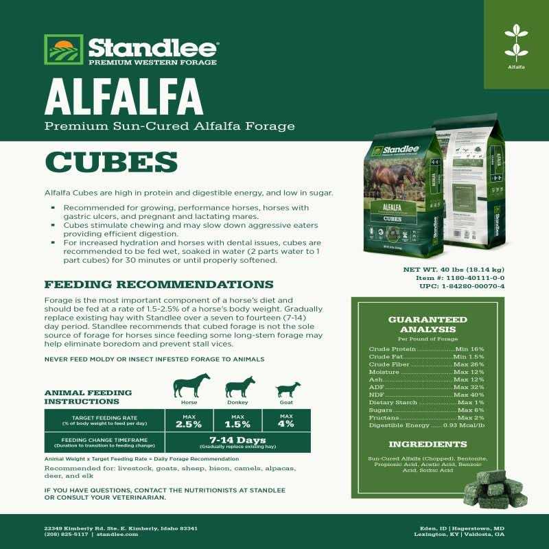 Standlee Premium Alfalfa Cubes Horse Forage, 40-lb bag; Nourish your stallion with superior-quality nutrition by feeding him Standlee Premium Alfalfa Cubes Horse Forage. The natural alfalfa is moderately high in protein, high in calories and digestible fiber to support the health of your equine friend. Standlee Premium Western Forage is coarsely grinded through a large die with heat and steam to create these premium alfalfa cubes. If your hoofed friend has dental problems or aggressively consumes his feed, soak the cubes in water for 30 minutes or until properly softened. Standlee always provides the freshest and best quality food for your equine friend!