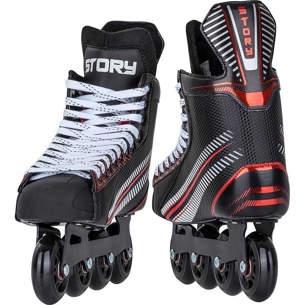 Story Mission is hockey inline roller skates for riders with an interest in skate hockey. They are perfect for high speeds and aggressive rides in the hockey hall with friends. They are both for beginners who are about to try out with skate hockey. As well as the more experienced riders, looking for a new pair of quality roller skates. The roller skates are made of a technically smart combination of materials. For the boot itself, the materials consist of textile and soft foam, as well as a hard shell for extra protection and strength. The fabric and the soft foam provides a comfortable boot of optimal comfort, for hours of fun in the hockey hall. The wheels, all of which are 76 mm in size with a hardness of 82 A and ABEC-7 ball bearings, provide a pair of fast and stable hockey skates that easily achieve high speeds. This is further strengthened by the flat setup of the wheels, which means that the wheels are of the same size and that they are all placed at the same height of each other. All to create better stability and fast speeds. In addition, the size of the wheels means that it is also possible to maneuver easily around the hall when rolling around opponents and quickly to score a goal. The blade of aluminum provides increased strength for the entire roller skate, and at the same time also helps with your take offs – so you can quickly get up to speed. Do you love skate hockey or is it just time to give this sport a go, then you will greatly enjoy these Story Mission hockey inline roller skates!