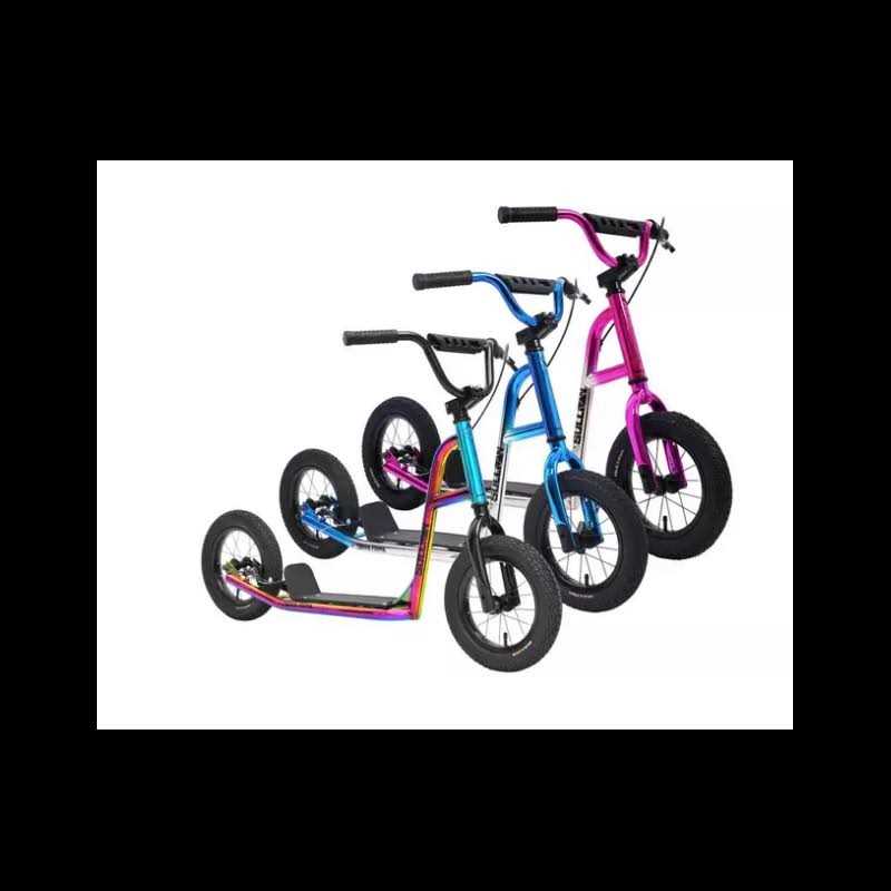 This all terrain scooter is our go-anywhere, do-anything big wheeler that is fast, easy to ride, and practical for all kids. It is loaded with safety features like the hidden front wheel axles and rubberised handle bar pad. The mirrored electro paint finish gives this scooter a stand-out color effect that is sure to turn heads!
