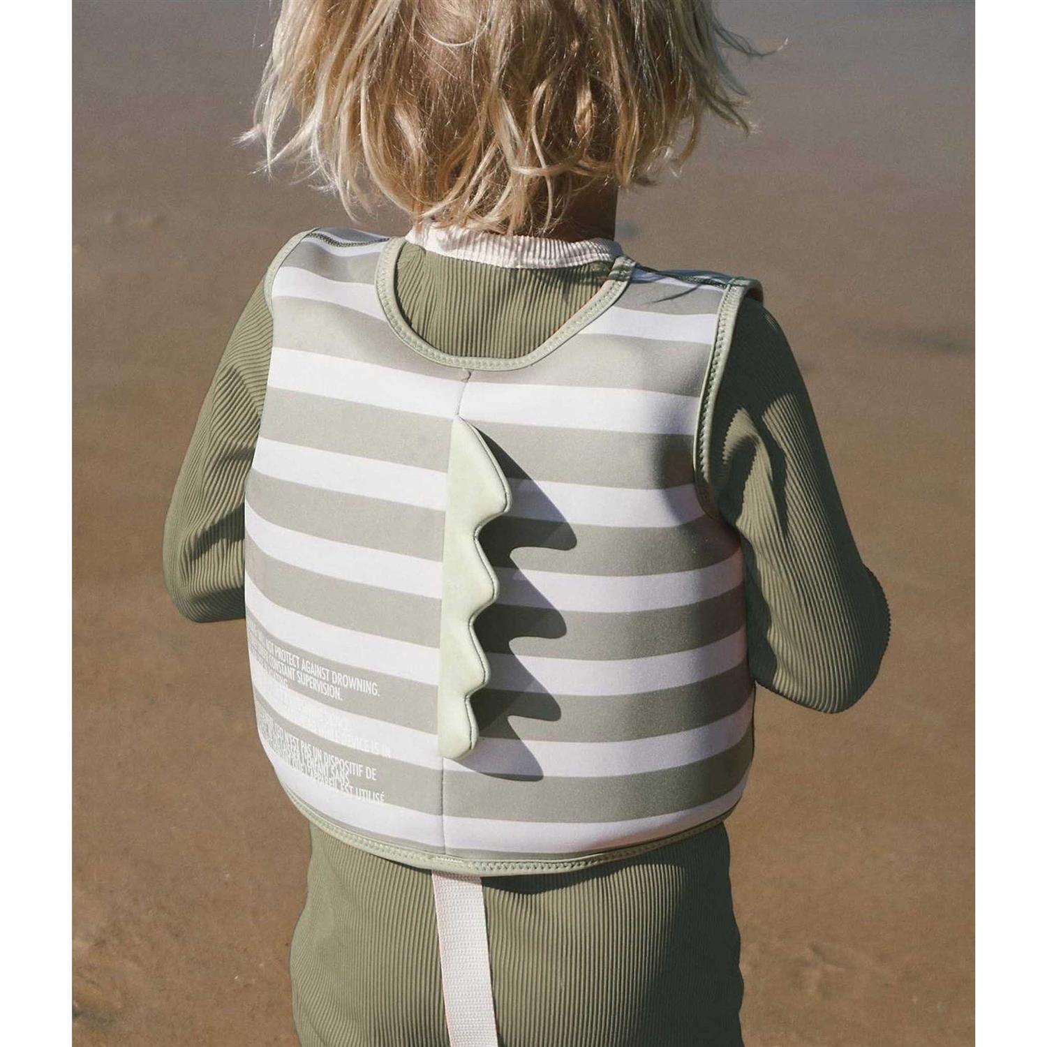 Green, white swim vest by SUNNYLiFE. The swim vest has a striped all-over print. It has foam inserts and a zip closure at the front. – Introduce your child to swimming. – Please note, sizes 1-2 and 2-3 have an adjustable safety strap between the legs.