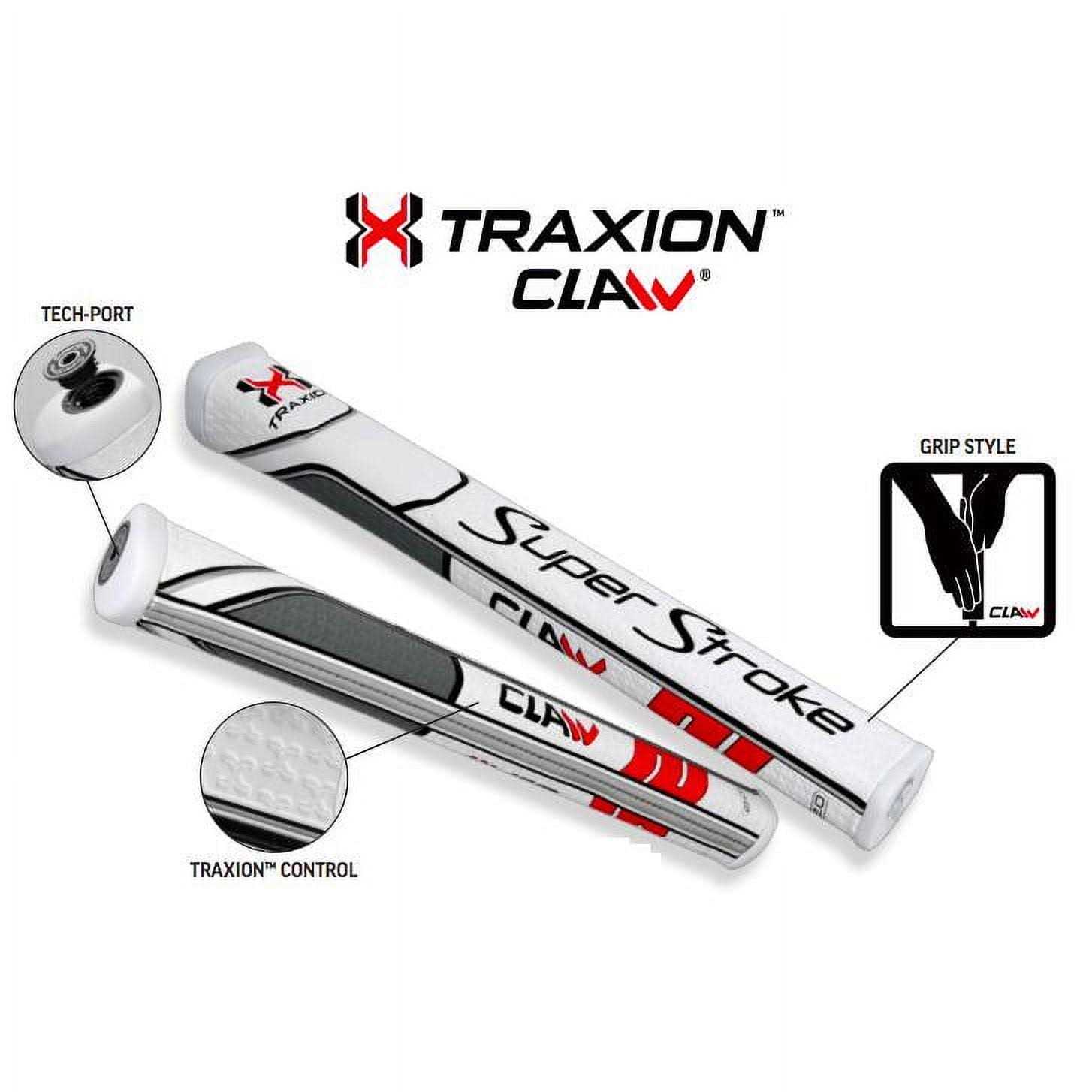 SuperStroke Traxion Claw 1.0 Grip – White/Blue/Grey Our new Claw profile is designed to work with the many variations of this fast-growing, deadly accurate putting style. The Claw ‘s unique design incorporates a pistol-style top section that helps lock in the upper hand, while its three flat sides increase surface area to accommodate different lower hand positions.