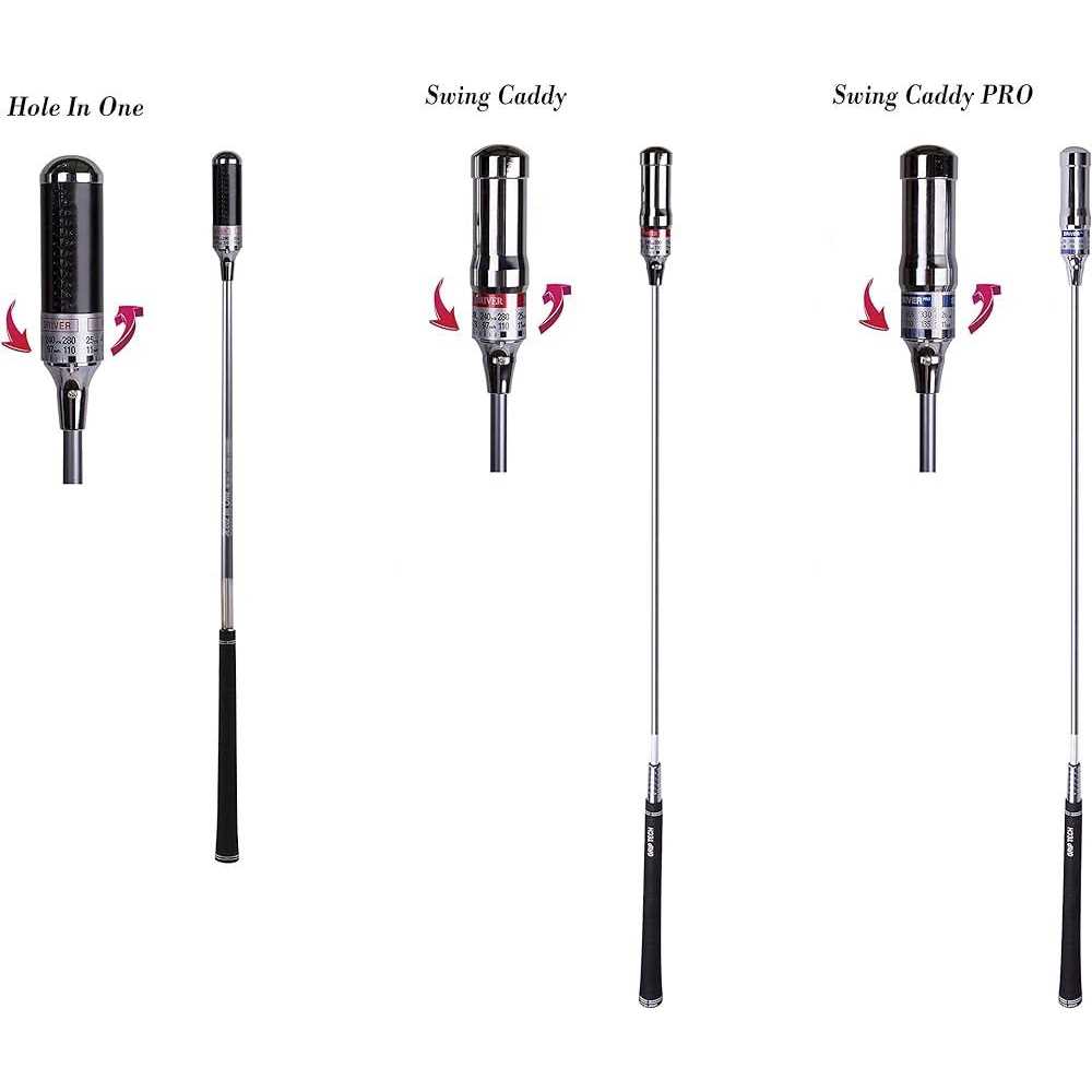 Swing Caddy Features: The Swing Caddy training aid trains you to swing clubs from Sand Wedge to Driver with 2 clicks at desirable impact/rhythm/tempo & follow-through by adjusting Control Scale for optimum distance/accuracy. Practice by selecting the desired distance and head speed. Enables you to locate the correct impact point. Increases your drive distance by 20 to 30 more yards with better accuracy GUARANTEED. Teaches a balanced swing and follow-through. Develops the muscle memory needed for a great swing. Enables the correct swing rhythm and tempo. This golf swing impact and rhythm trainer gives you the freedom to practice your swing indoors or outdoors. Swing Caddy PRO (new) #1 Rated Golf Swing Trainer NOW WITH HIGHER SPEED CALIBRATION and WIDER DYNAMIC RANGE (25 ~ 330 YARDS up to 135mph swing speed!) FASTER SWING SPEED (11 ~ 135 MPH) IMPROVE TEMPO & RHYTHM BETTER ACCURACY Newly designed golf swing trainer for the power hitters with even higher swing speeds (11 – 135 MPH) and longer balls (25 – 330 yards).